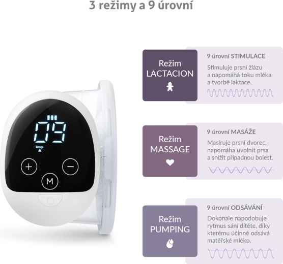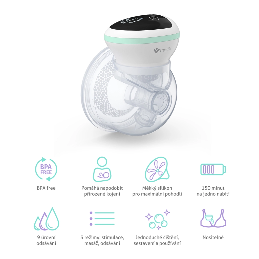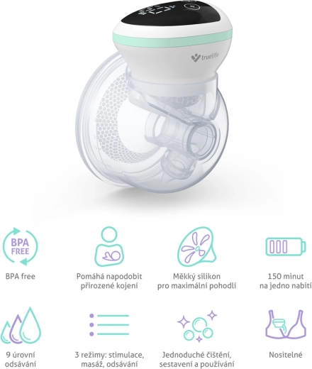 The practical TrueLife Nutrio BP W5 electric hands-free breast pump brings relief at home and on the go. It offers 3 modes (stimulation, massage, expression) with 9 intensity levels, comfortable cord-free wear thanks to the integrated battery, and hands-free use for example with a special bra. A soft silicone shield, 210 ml container, LED display with timer, and BPA-free materials ensure safe, comfortable use.