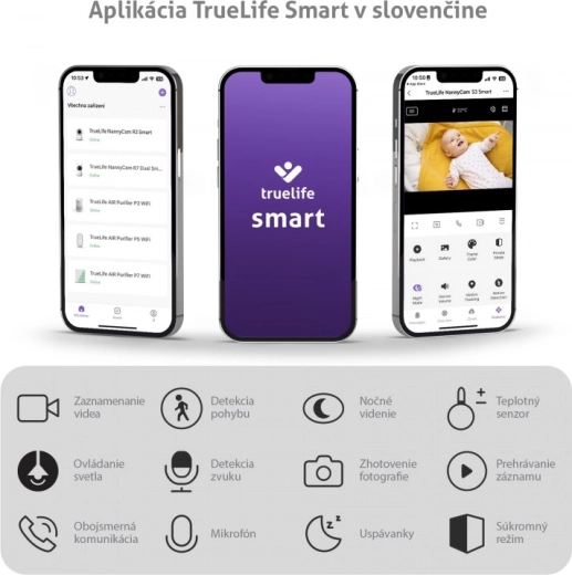 The monitor works via the secure TrueLife Smart app (CZ localization) with five-layer protection and AES encryption. You get unlimited range from anywhere in the world, the option to connect up to 16 cameras, and an unlimited number of users. Of course, there is photo and video recording to a microSD card. The flexible bendable mount lets you attach the monitor almost anywhere—such as to a crib frame.