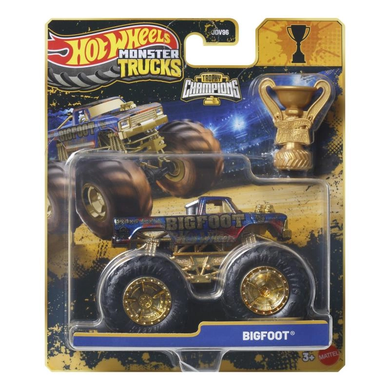 The special commemorative Hot Wheels Monster Trucks Trophy Champions collection brings the iconic BIGFOOT in a premium finish. A robust build, large profiled wheels, and gold details emphasize the legendary look, while the included trophy adds the right atmosphere to every race. The model is perfect for both play and display in a collection.