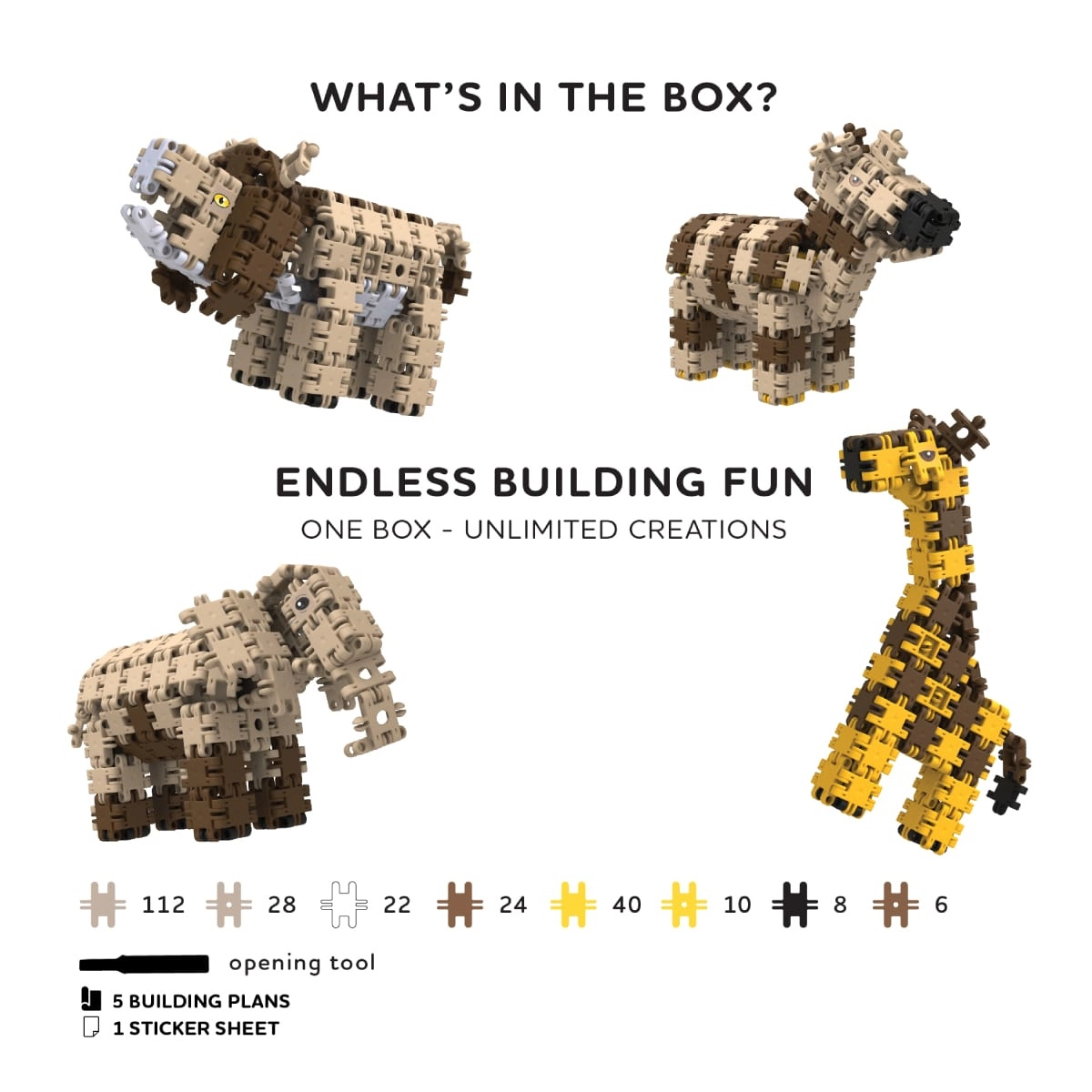 - Build animals like a lion, elephant, giraffe, or birds