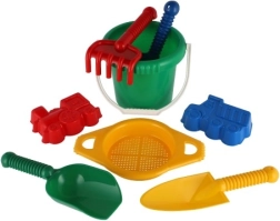 Includes all the necessary tools for building and creative play in the sand - bucket, sieve, spades, rakes, and two molds.