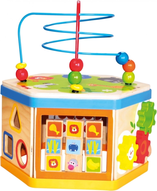 The multi-sided motor skills toy captivates curious children with vibrant colors and a variety of activities enhanced with an educational dimension. Children can guide beads through a maze, count balls, slide animal tiles, turn them and match them with their food, rotate gears, insert blocks, and learn to tell time. The toy is robust, made from thick plywood. Main features: cube with lid and 3 shape sorter pieces; develop spatial and time orientation; match shapes and colors; practice fine motor skills; sturdy wooden design