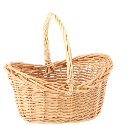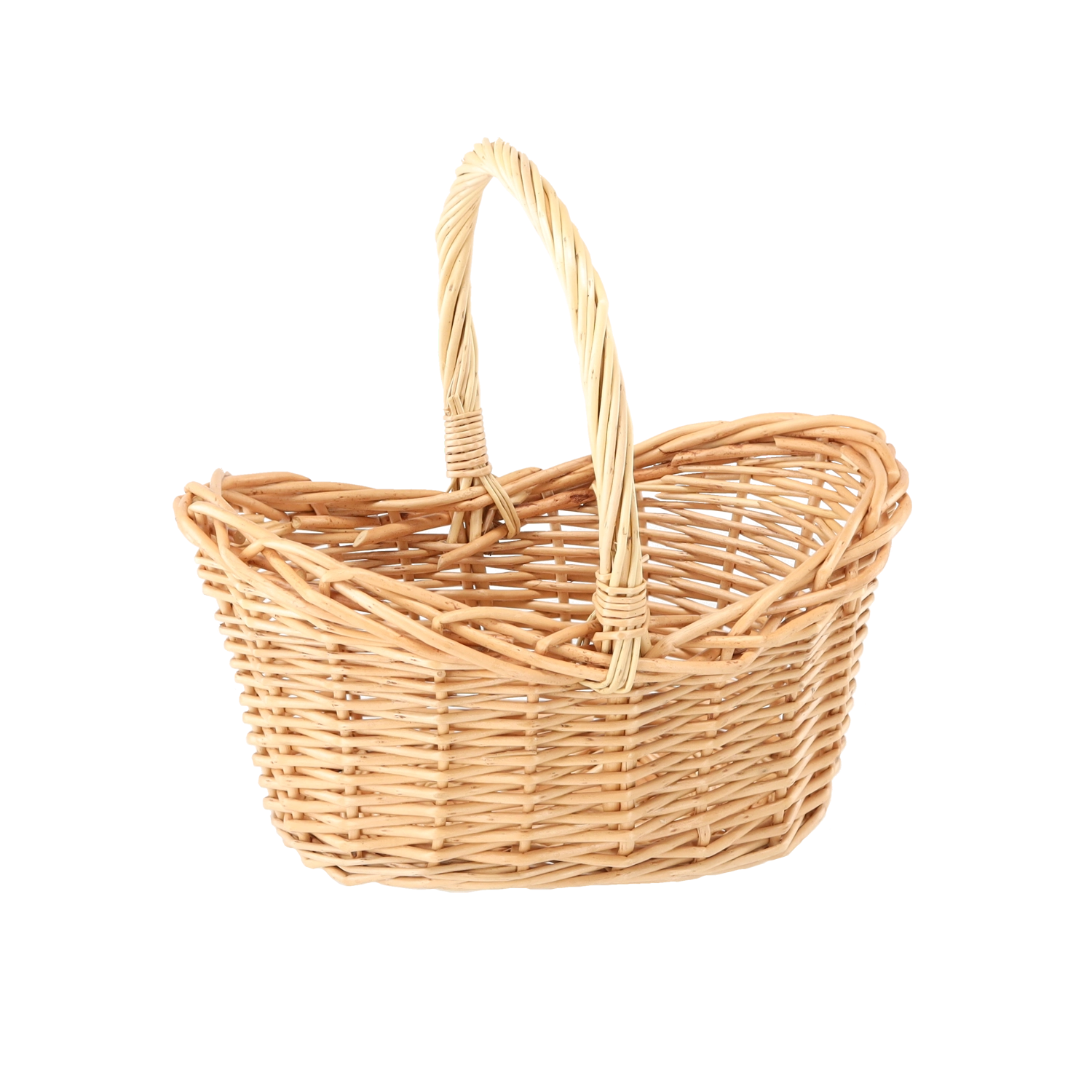 A versatile wicker basket in a natural color, ideal as an Easter basket, storage organizer, and stylish decoration. It is handwoven from quality wicker, featuring a sturdy integrated handle, an oval shape, and a light yet durable construction for everyday use.