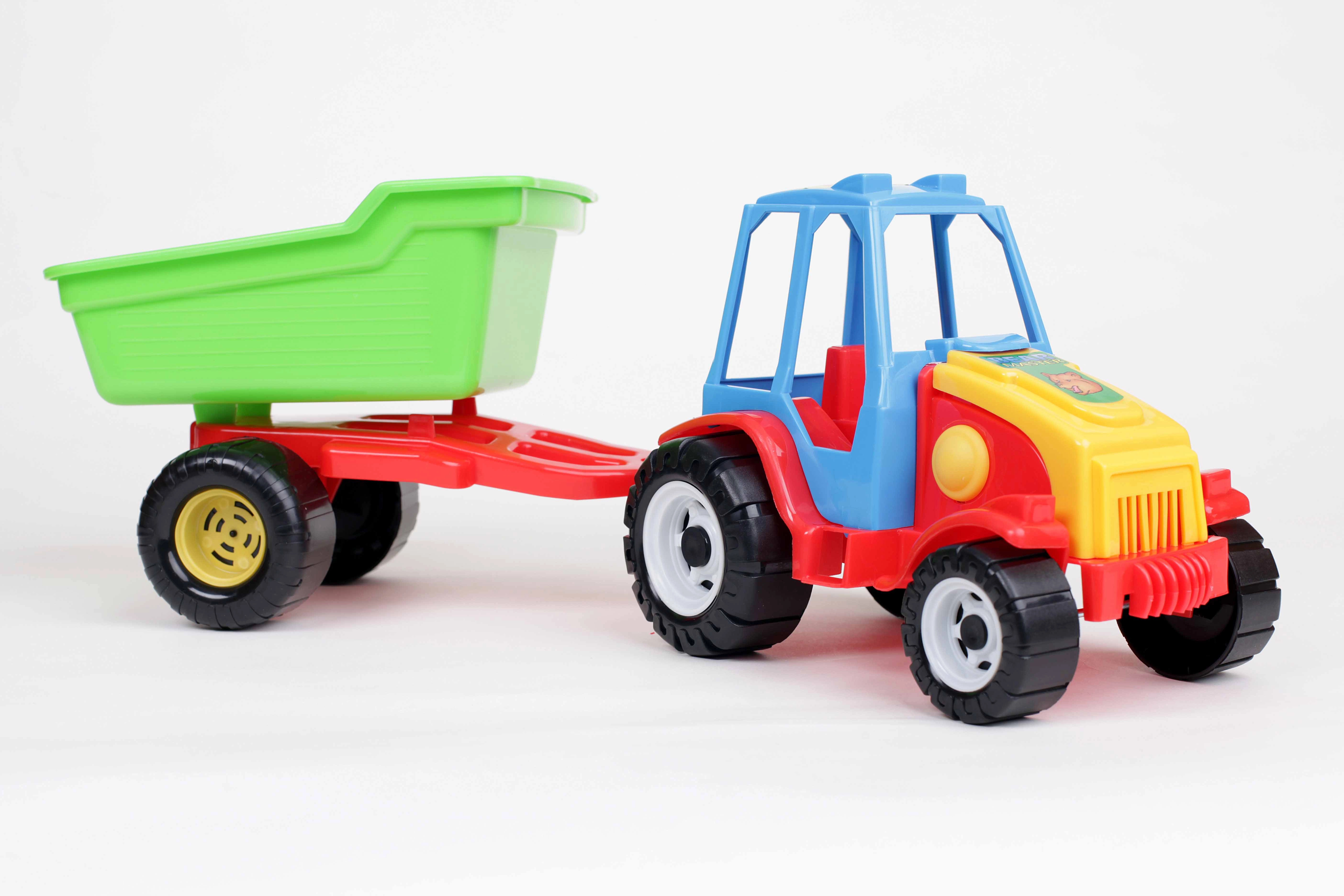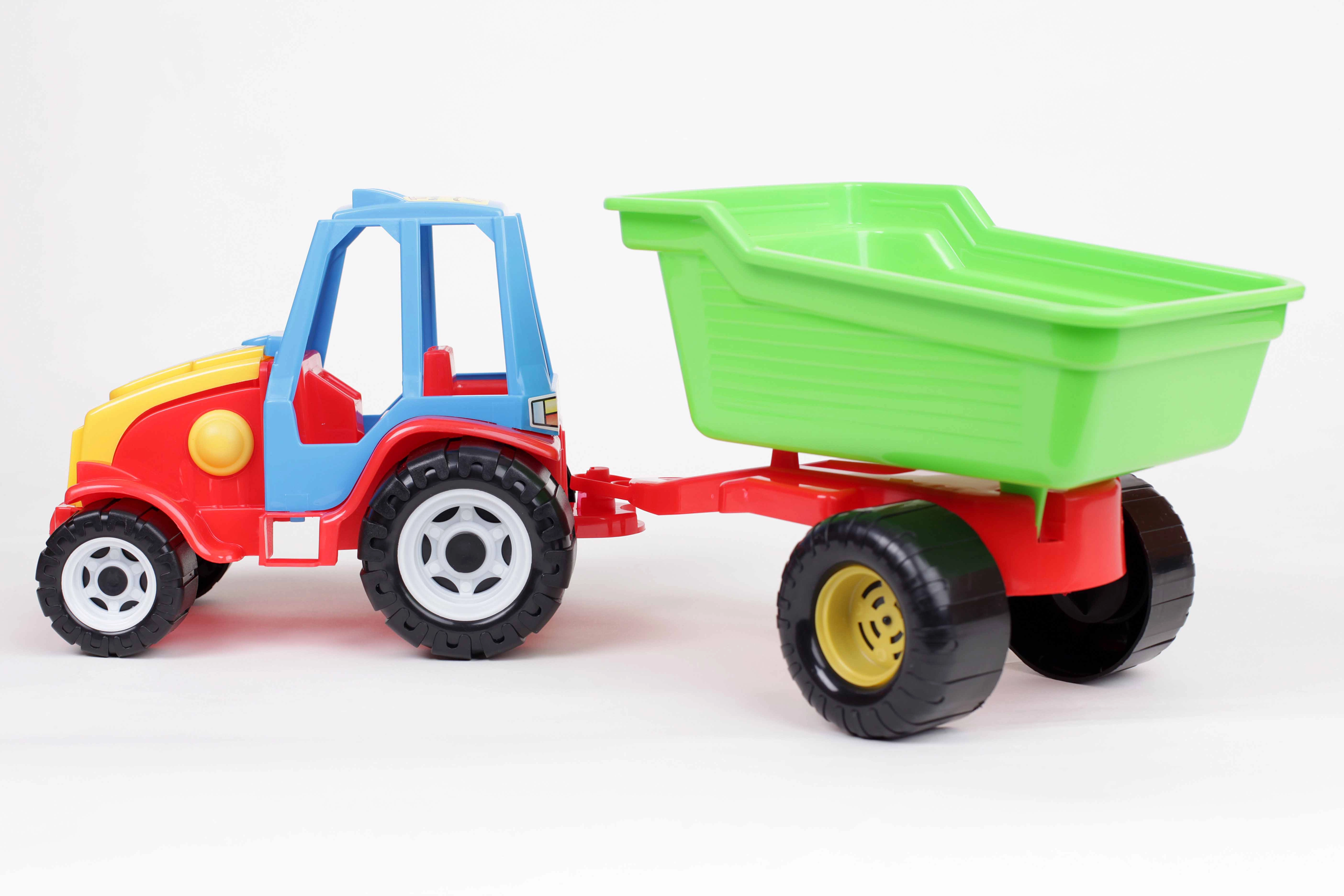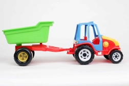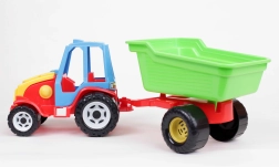 Discover fun with a stable plastic tractor featuring a single-axle trailer that can be easily detached and tipped backward. Large black wheels ensure smooth movement on floors and in sand, and the colorful design invites everyday play. The toy is made of high-quality, safe materials that do not contain heavy metal compounds.
