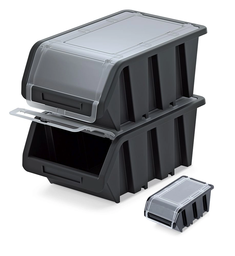 A practical plastic storage box with a transparent lockable lid is ideal for neat storage of tools, fasteners, and small items in a workshop or garage. Thanks to its durable construction, stackable design, and the option to hang it on a wall, it saves space and ensures quick access to contents without opening.