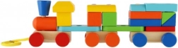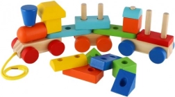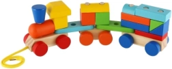 This pull toy and construction set is a great way for children to develop their skills and imagination. The colorful wooden train consists of three durable platforms and many parts that can be assembled freely.