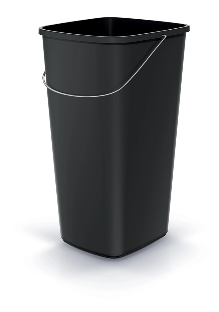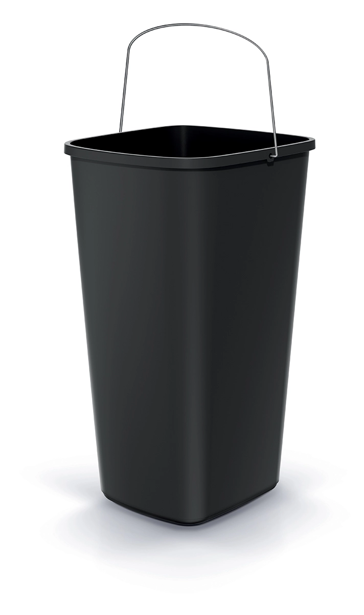 Thanks to its compact dimensions of 28.7 × 26.4 × 49 cm and tapered shape, it fits even into narrower spaces—next to a desk, in a kitchen corner, or in a cleaning zone. The smooth surface minimizes dirt buildup and significantly simplifies maintenance. The sturdy metal handle makes handling and carrying easier, while the open, lidless design speeds up everyday waste disposal.