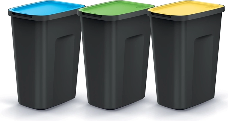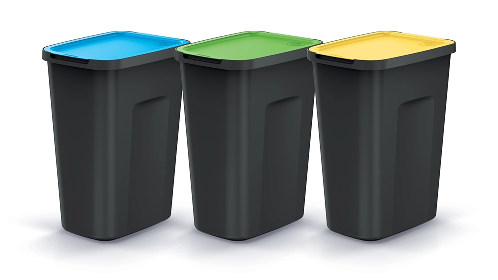 A practical set of three COMPACTA Q FLAP PLUS bins with a capacity of 3×35 L made from recycled plastic delivers efficient waste sorting for homes and offices. Compact dimensions, modern design, and a lid with a stay open function for easy waste disposal. The durable surface is resistant to alcohol, fats, and oils and is easy to clean with warm water and a mild detergent.