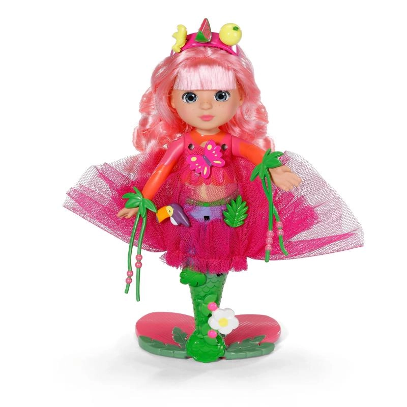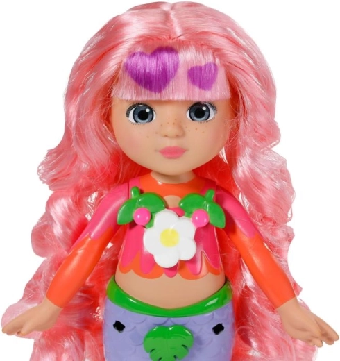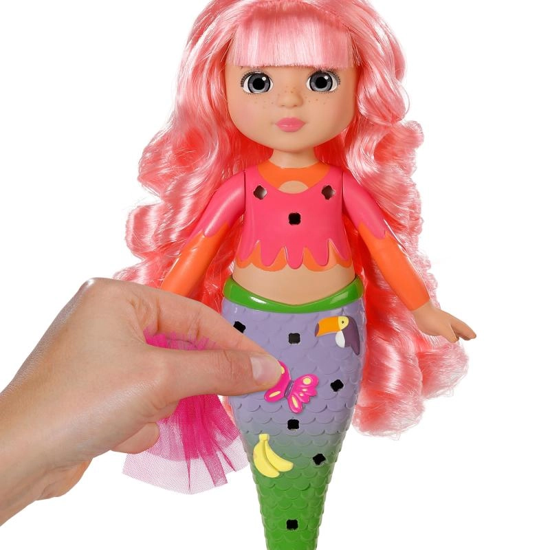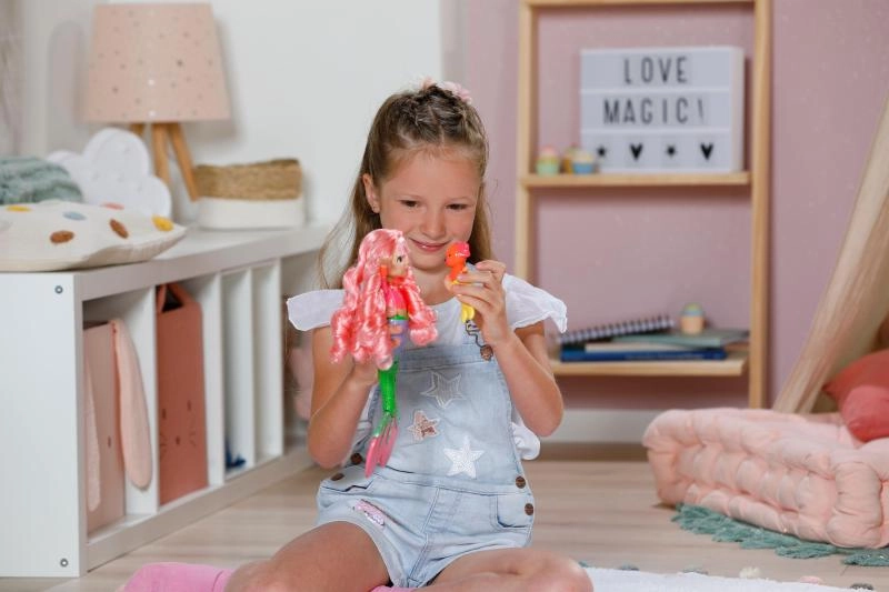 Step into the sparkling world of BABY born Glam Up! Sunshine is a mermaid who loves makeovers – from hairstyle to fin. Thanks to her long pink hair with a magical UV effect, you can create a different look every time and enjoy a true wow moment in the sun. The included textile accessories, colorful snap-on decorations, and a cute mini animal with a detachable fin open up a world of imaginative styling and storytelling.