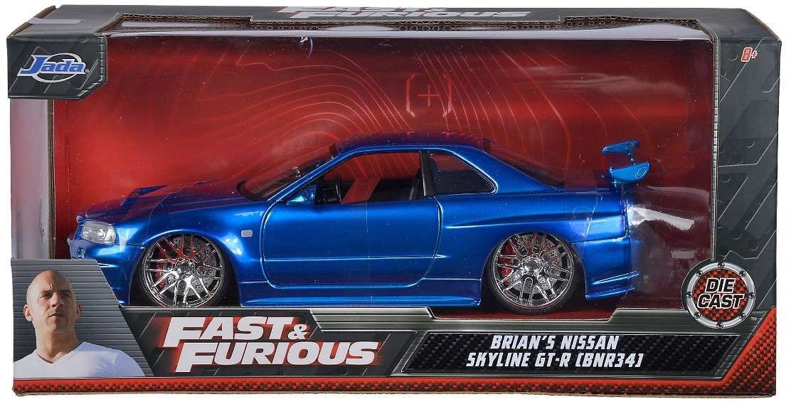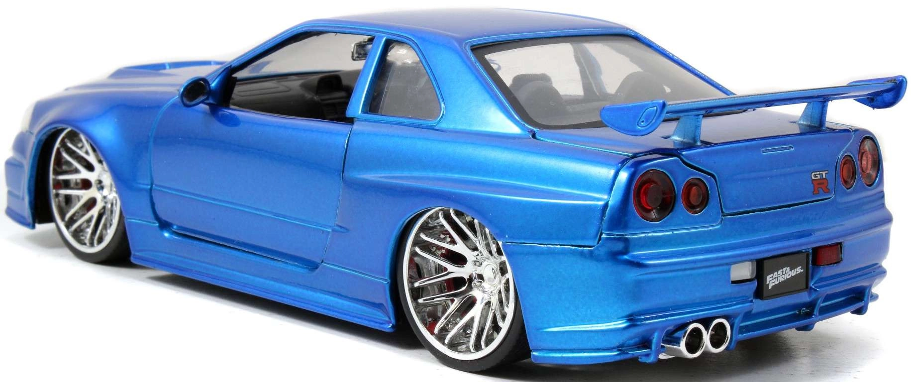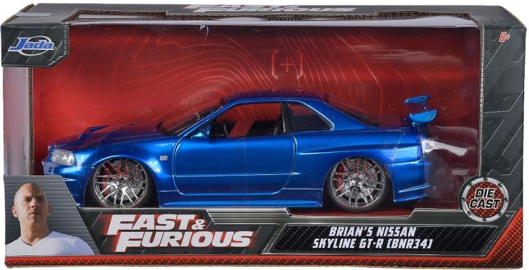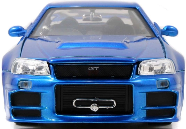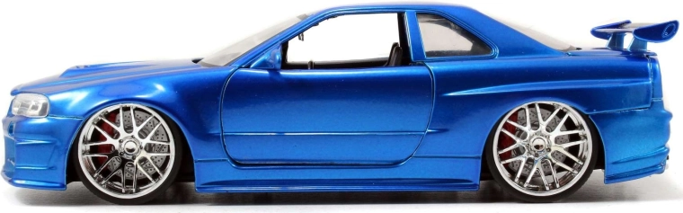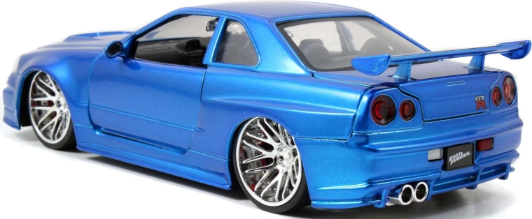 An iconic collectible model of the NISSAN Skyline from the Fast & Furious series in approximately 1:24 scale (length ~19 cm) will delight movie fans and car enthusiasts alike. It features a metal body, opening doors, hood, and trunk, and a finely detailed interior and engine bay. Great as a display piece and a toy for kids aged 8+.