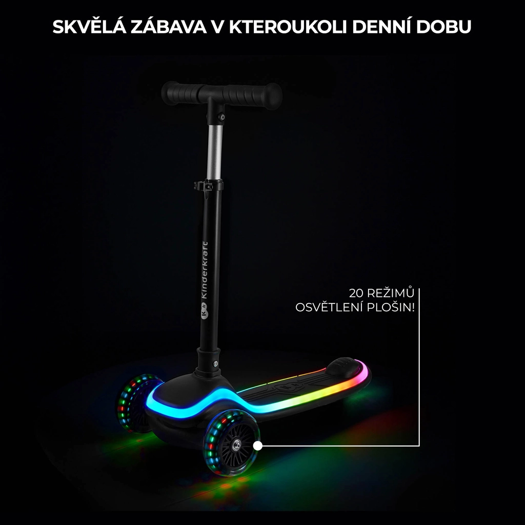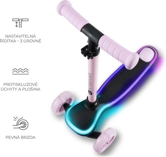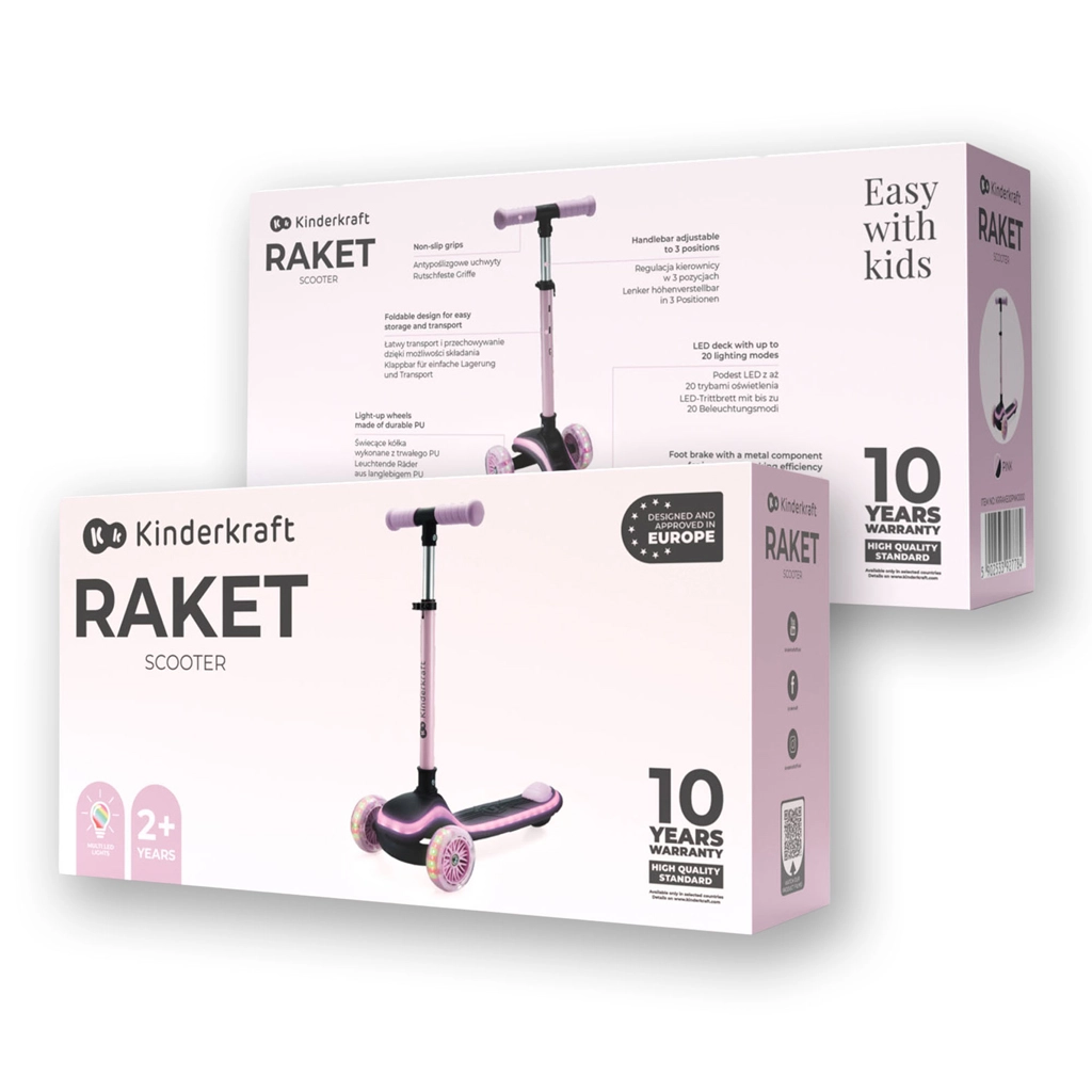 Discover the joy of riding with the KINDERKRAFT Raket Pink three-wheel kids’ scooter. Intuitive lean-to-steer control builds balance and coordination, while the LED-lit deck and RGB light-up wheels boost visibility and fun. With adjustable handlebars, quick folding, and quiet PU wheels with ABEC-7 bearings, it’s the perfect choice for first riding adventures.