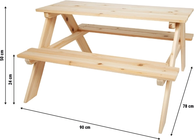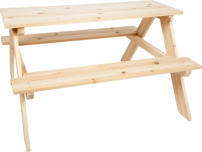 A versatile children's picnic table made of solid wood with integrated benches offering stability, safety, and a natural look for outdoor and indoor use. Thanks to its robust construction, rounded edges, and comfortable seat height, it is ideal for dining, crafting, and play. The untreated wood can be easily finished with paints or oils to match your style.