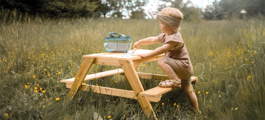 Give children their own place for games, crafts, and first picnics. The Small Foot children's picnic table made of durable solid wood stands out with its natural look, sturdy A-frame, and integrated benches on both sides. Rounded edges and a comfortable seat height support safe and ergonomic seating.
