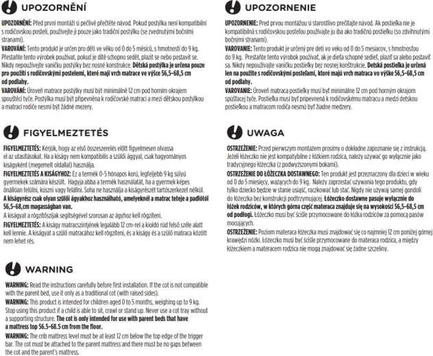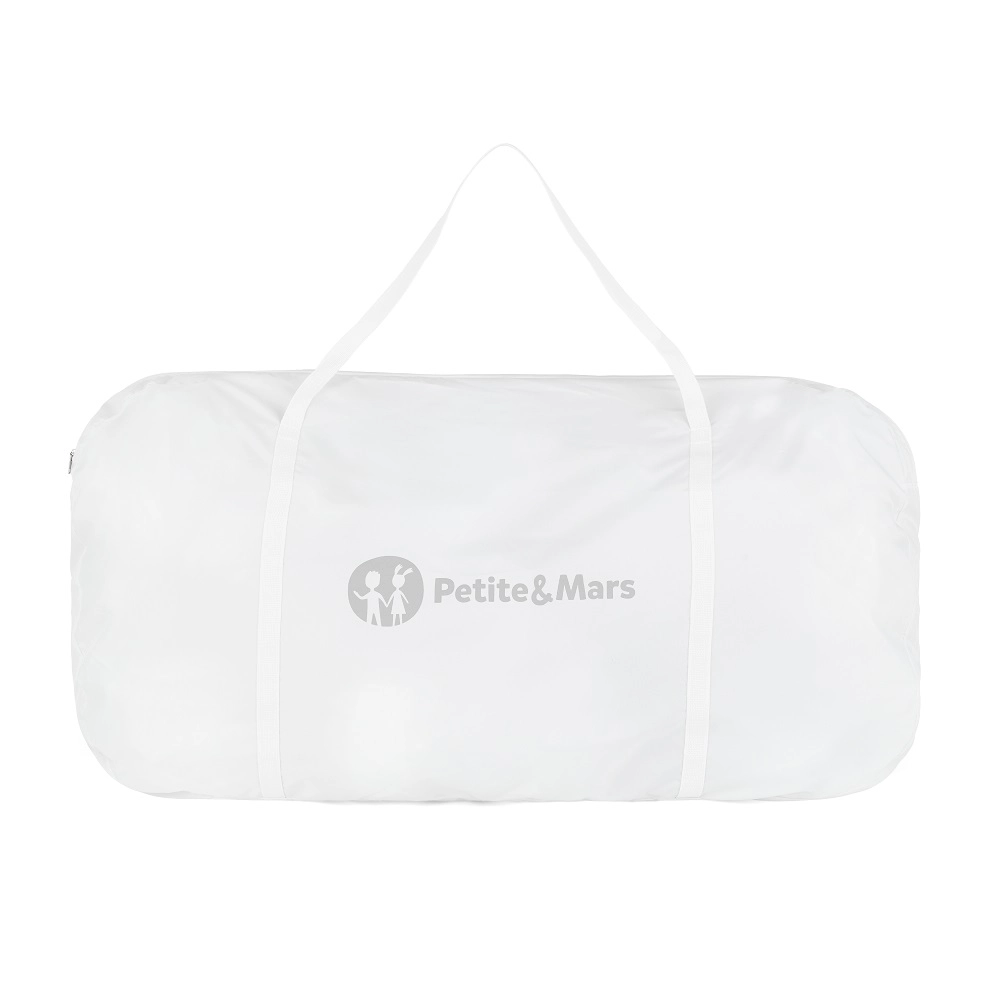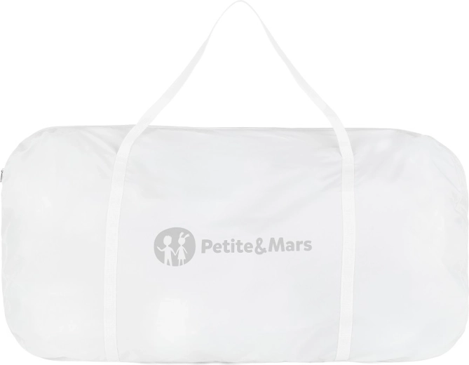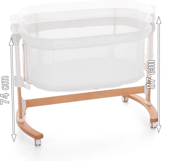 Adjust the height easily to 5 positions to align perfectly with the parents’ bed (ideal for mattress top height 56.5–68.5 cm). The base with wheels and brakes allows convenient movement around the home. For your baby’s comfort, a mattress with a washable cover is included. The entire crib can be folded and stored in the included bag, making it ideal for travel.