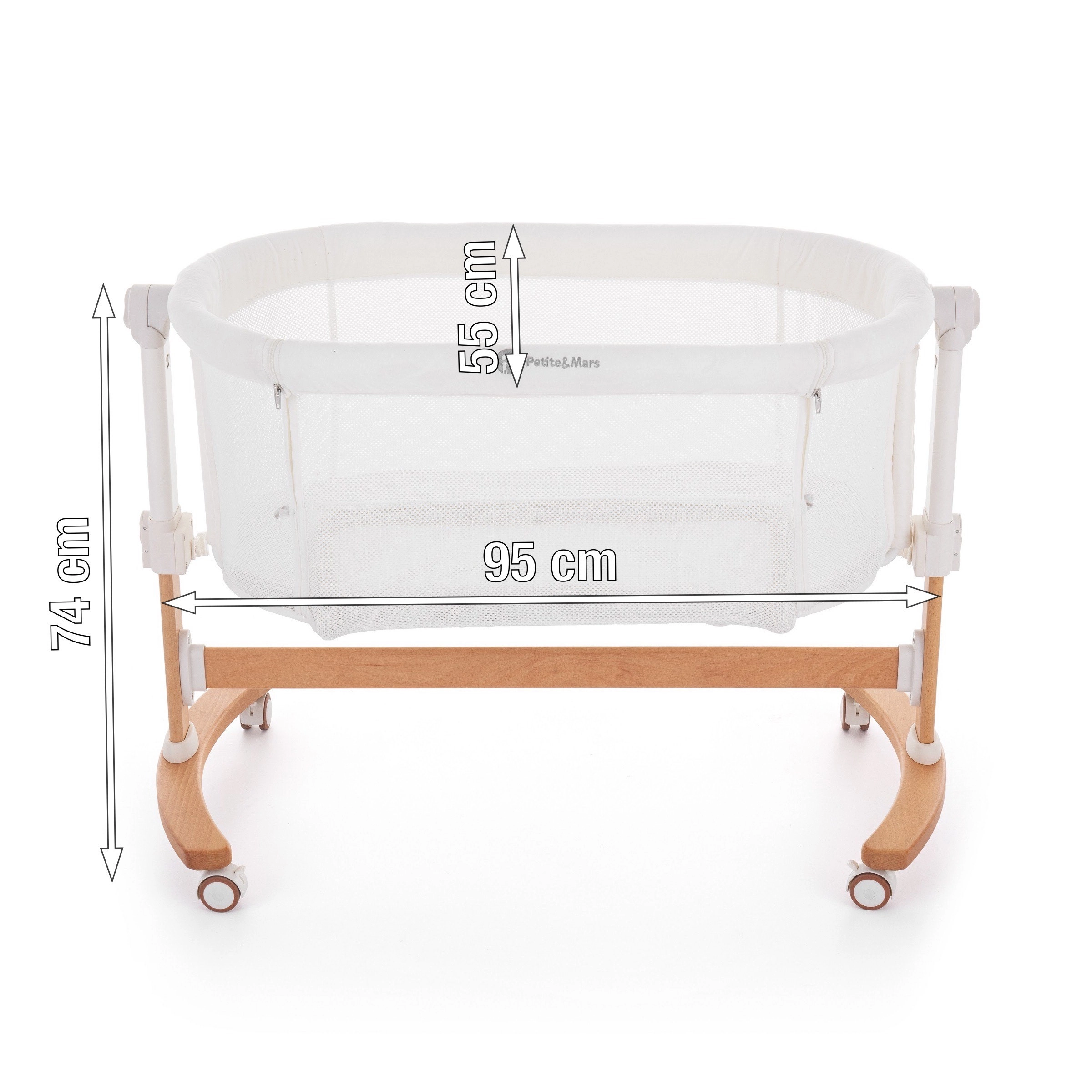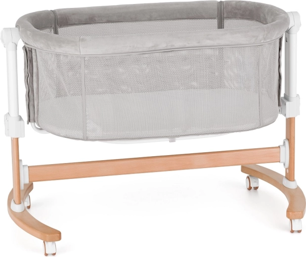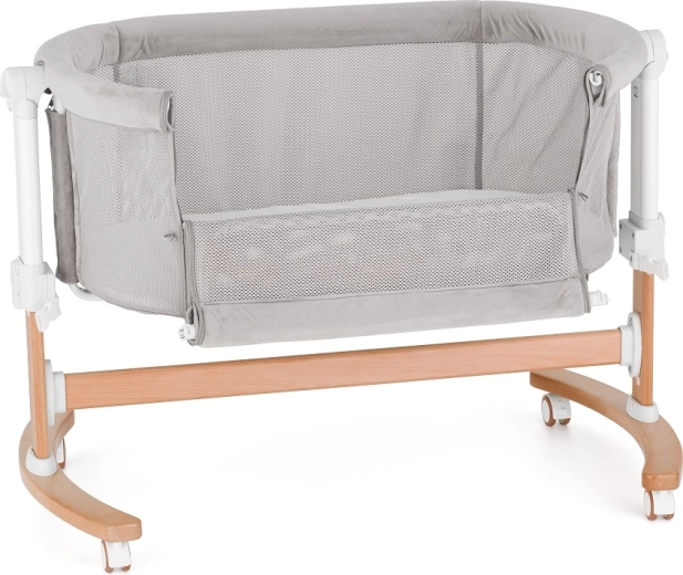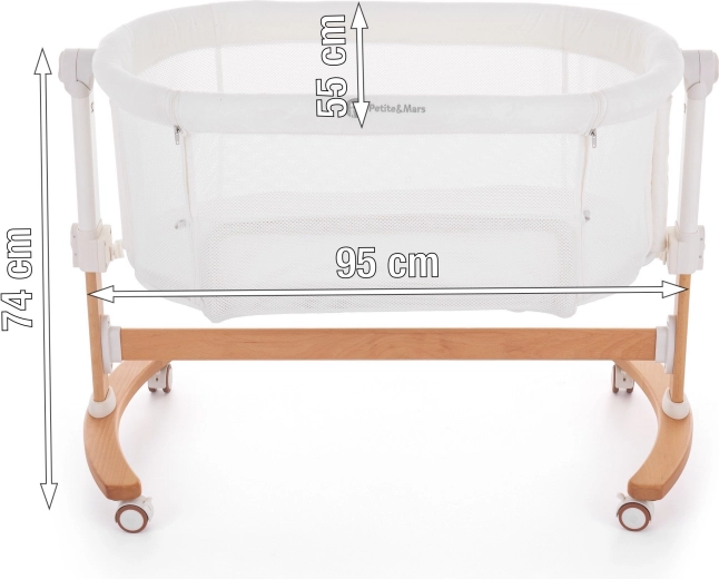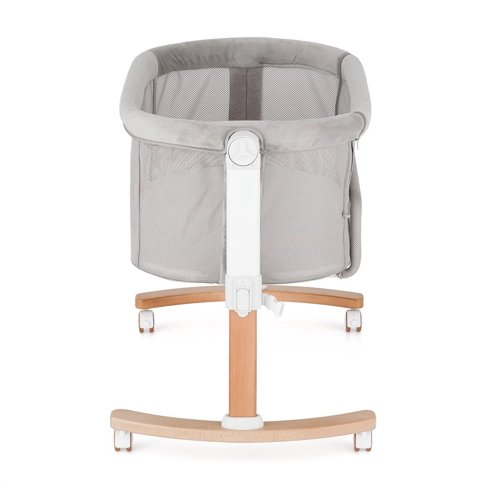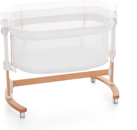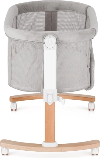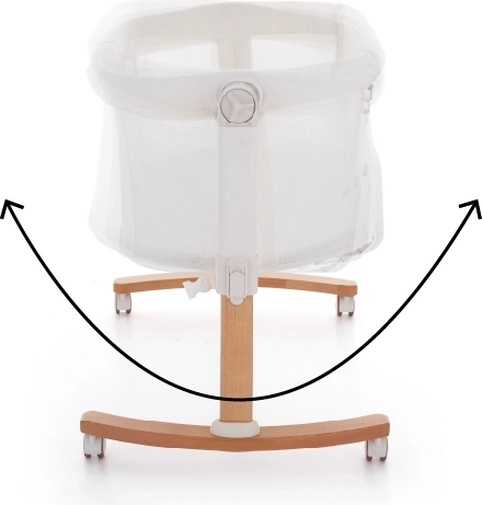 The integrated rocking function helps your baby fall asleep faster. A stable wooden base with wheels and brakes enables smooth rocking and easy repositioning.