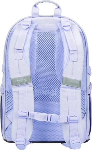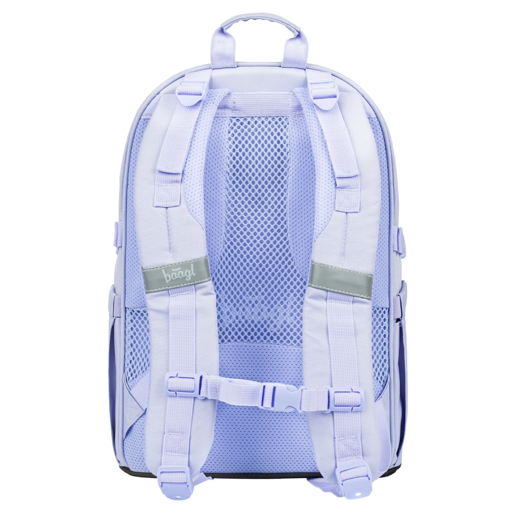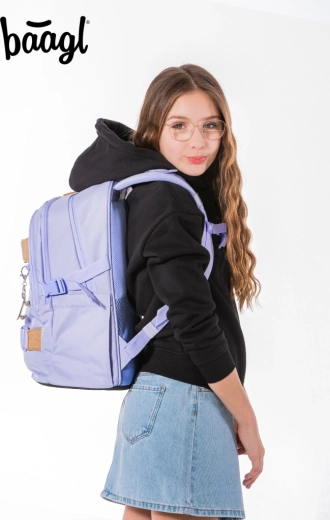 A complete BAAGL school set in a soft lilac shade combining an ergonomic backpack with skateboard straps, a spacious pencil case, a light sports bag – gym sack, a stylish waist bag, and a protective laptop sleeve. All made from durable, water-repellent and recycled materials, with YKK zippers, thoughtful organization, and reflective elements for safety.