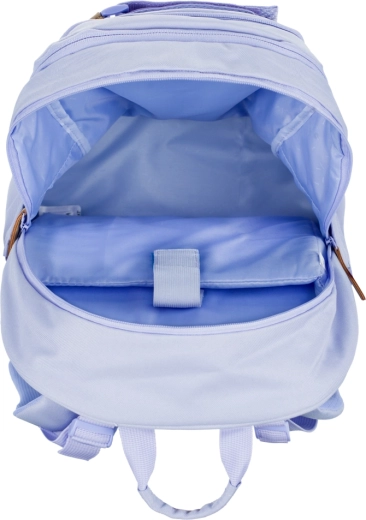 The set is completed by a sturdy pencil case with a flip divider, a zip pocket and a timetable slot; a practical gym sack for indoor shoes or sports gear with drawstring closure; a modern waist bag with a bi-directionally adjustable strap and a quality two-way zipper; and a protective laptop sleeve up to 15". All in a unified, elegant lilac design.