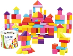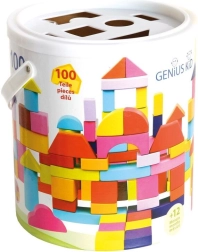 The bucket contains 100 colorful blocks that stimulate children's creativity.