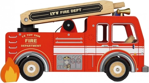 Wooden fire truck LE TOY VAN with extendable ladder and hose. Sustainable materials, non-toxic paints, plastic-free. Great for imaginative play.