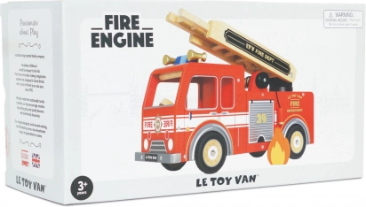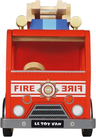 A stylish wooden fire truck by LE TOY VAN offers kids endless possibilities for imaginative play. Its robust build from sustainably sourced wood, non‑toxic water-based paints, and a fully functional extendable and rotating ladder with a wind-up hose supports fine motor skills and creativity. The toy is plastic-free and designed to last.