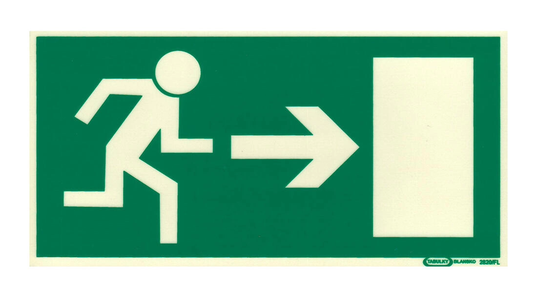 Photoluminescent safety sign Right Emergency Exit made of durable plastic in the format 210 × 105 mm ensures clear and quick guidance during evacuation, even in the event of a power outage. Thanks to its self-illumination, the marking is easily visible in the dark and helps reduce risks in workplaces, buildings, and public areas.