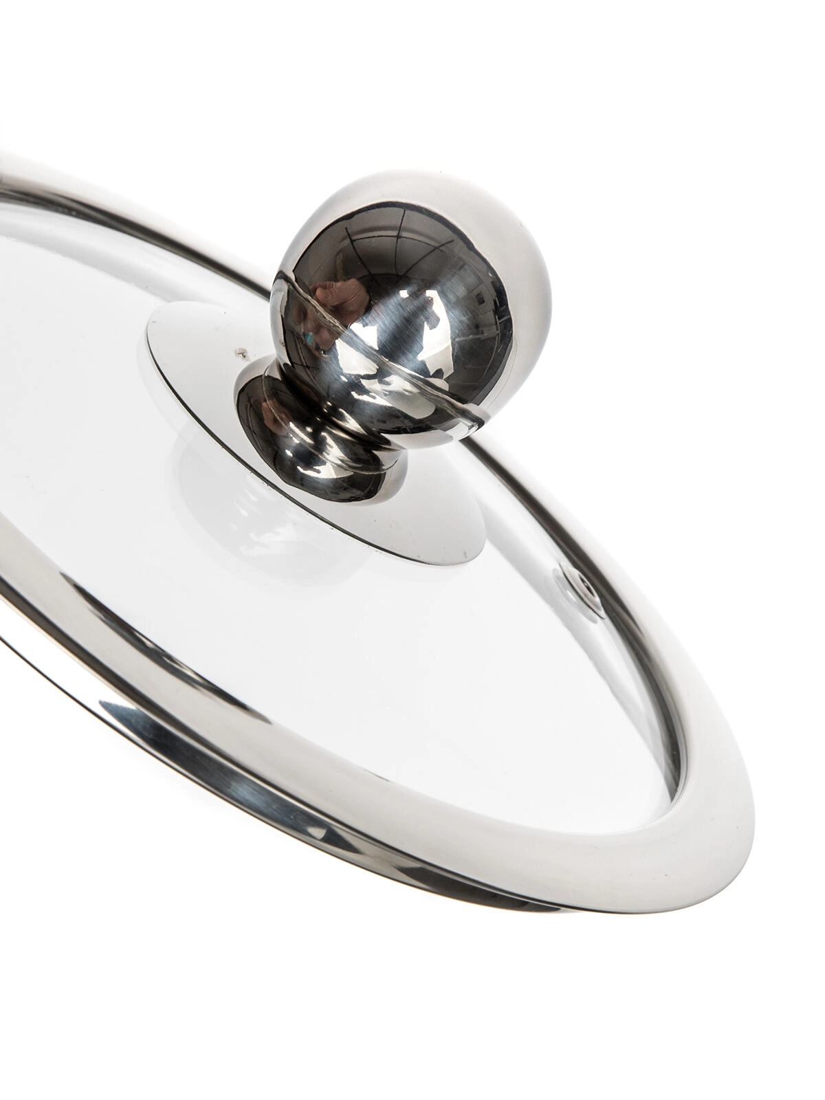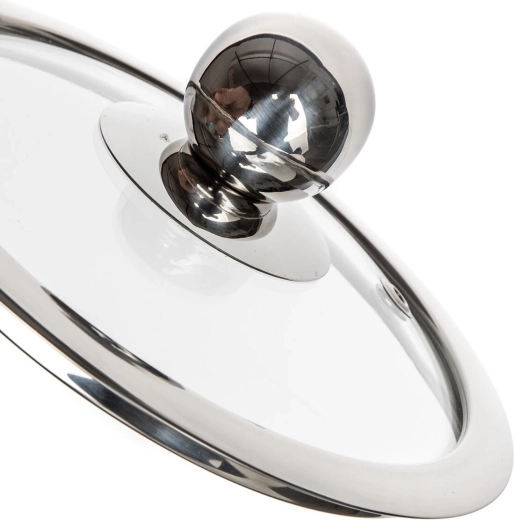 The transparent tempered-glass lid with a metal knob keeps heat and steam inside while letting you monitor cooking without lifting the lid.