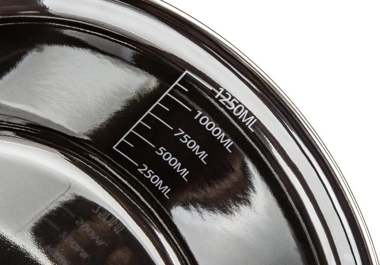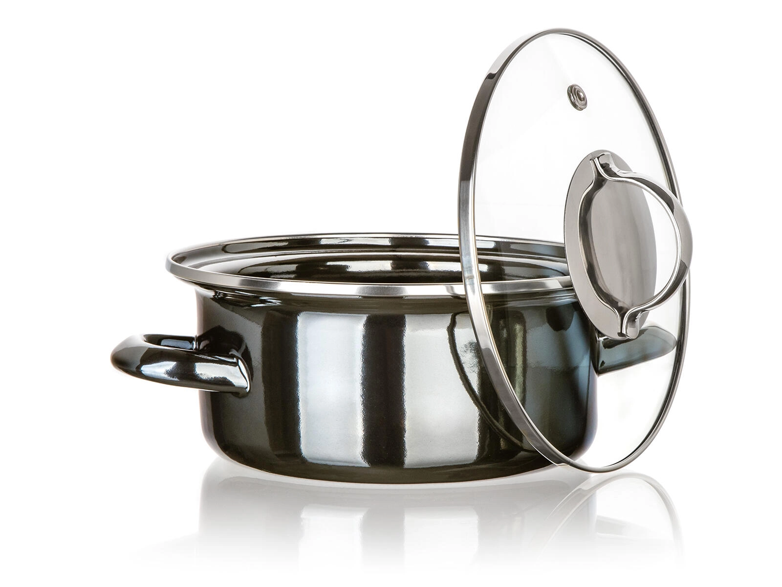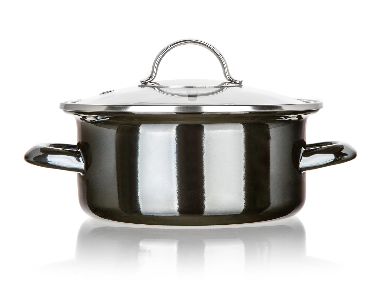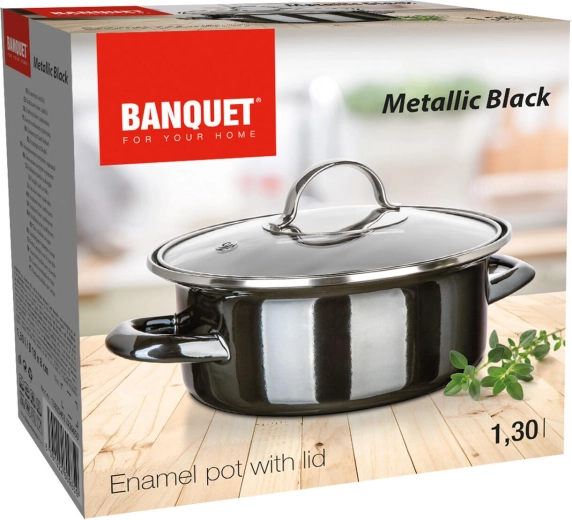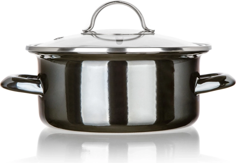 Elegant enamel pot in Metallic Black with a glass lid, ideal for everyday cooking. It offers a diameter of 18 cm, a capacity of 1.3 l, and is suitable for all types of hobs including induction. Durable build, easy maintenance, and clear visibility thanks to the transparent lid.