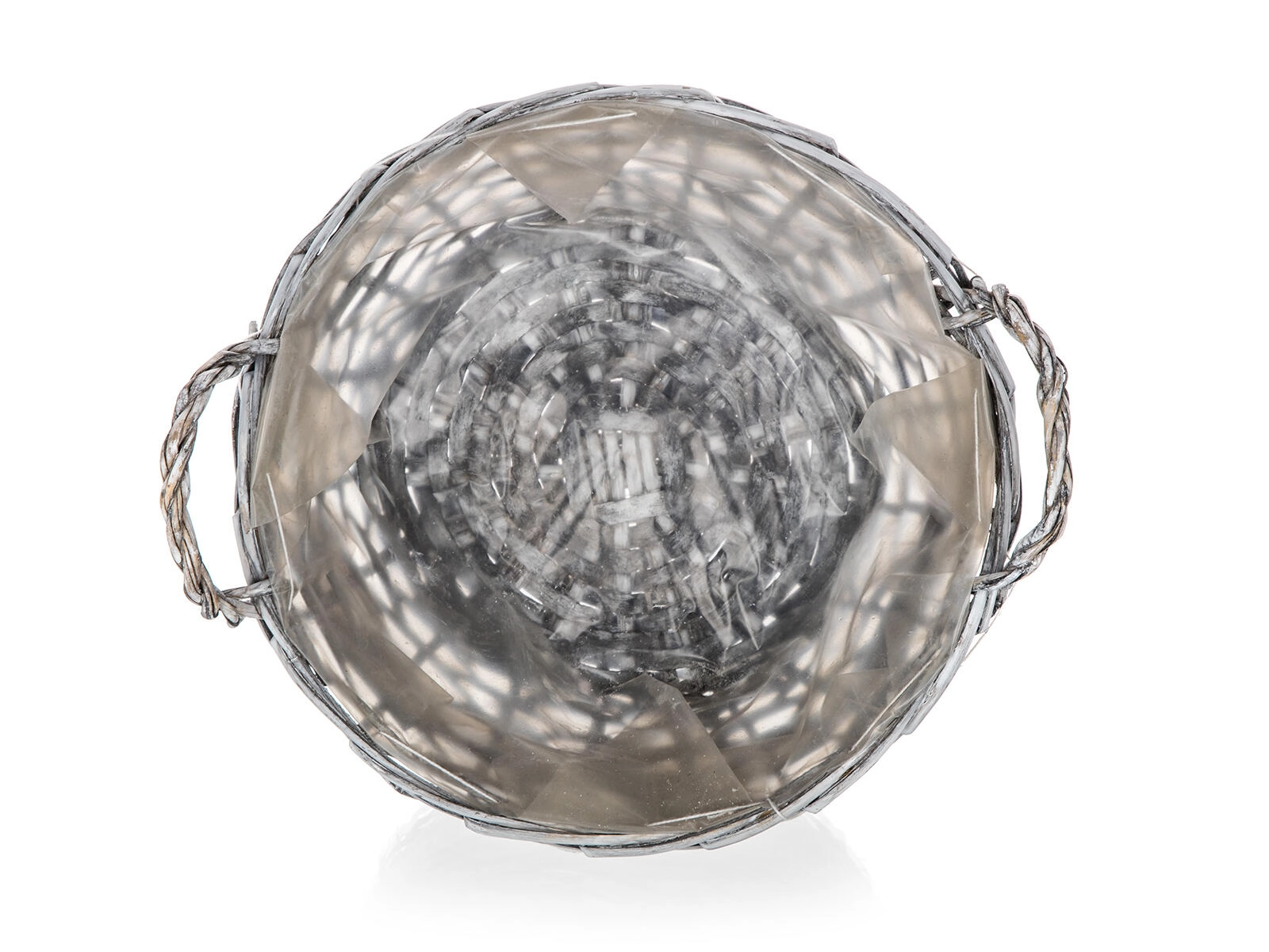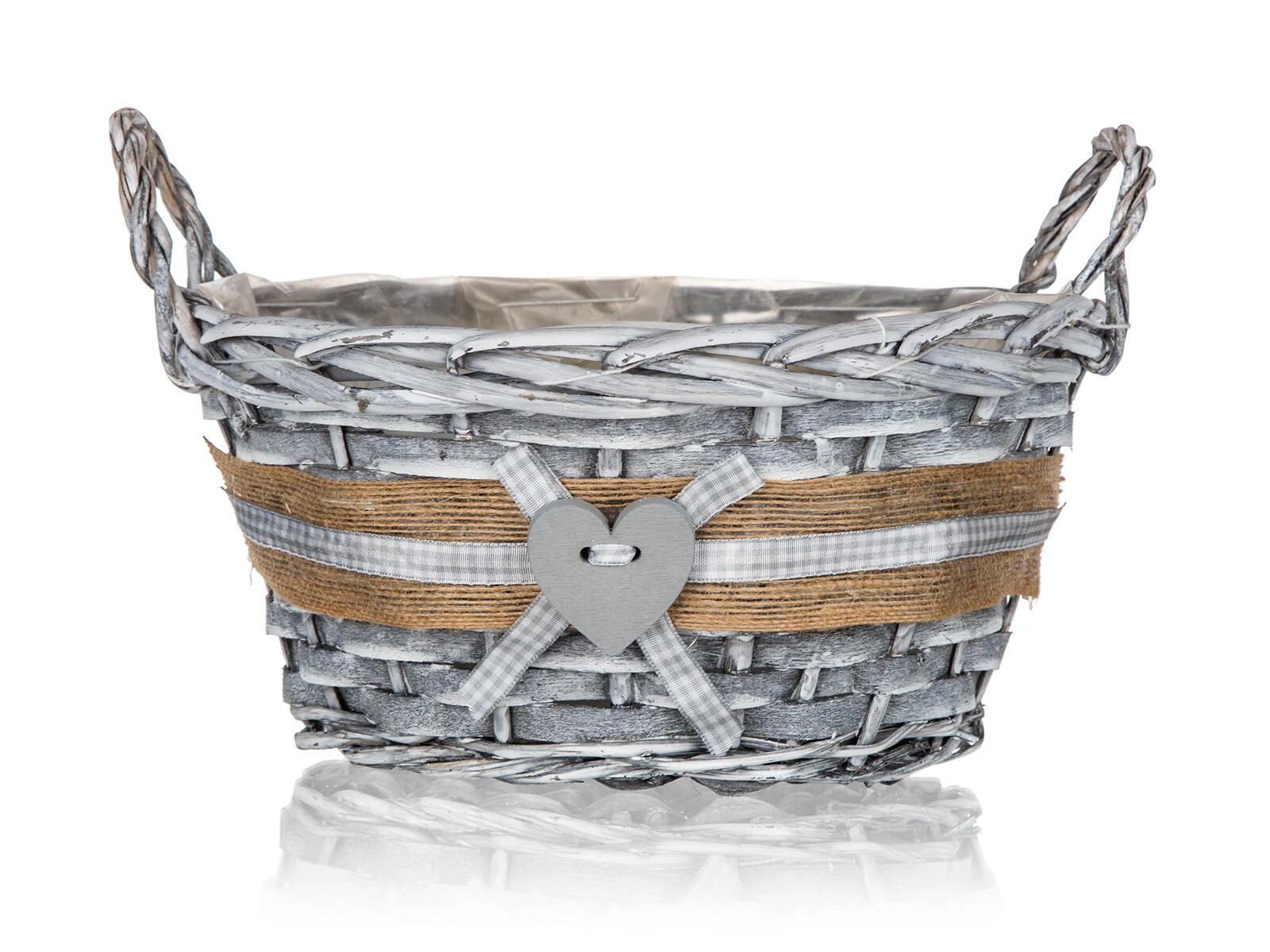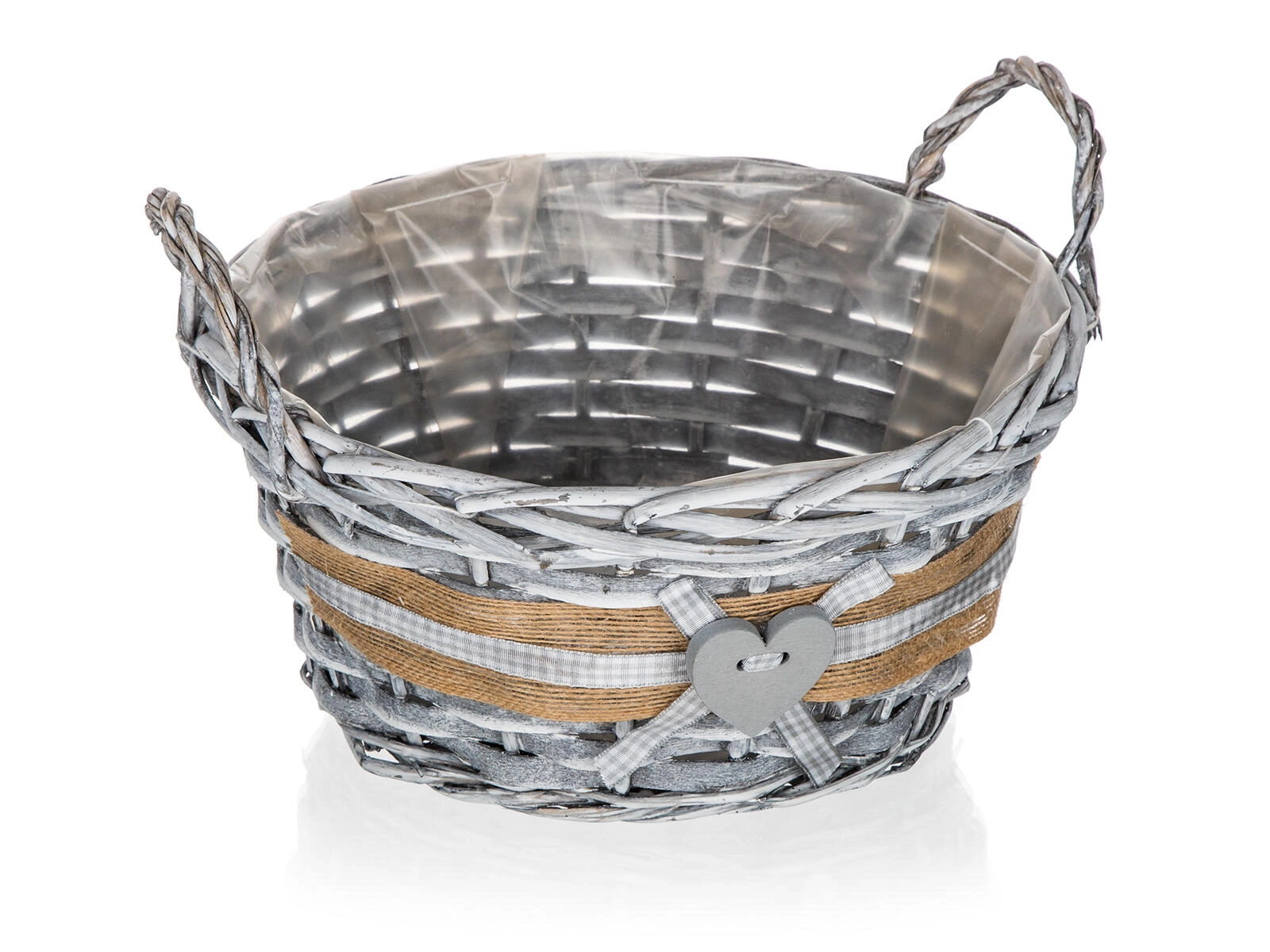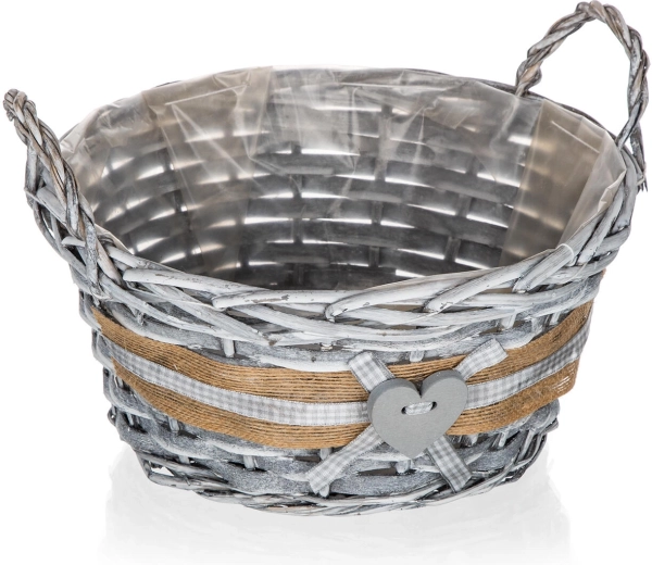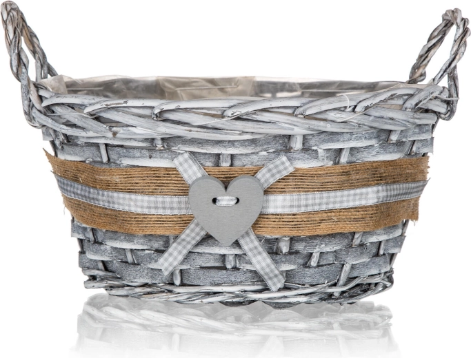 Stylish GRIS wicker basket in a round shape measuring 25 × 12 cm, ideal for decorative arrangements, storing small items, and as a plant pot cover. Thanks to the inner plastic liner it doesn’t leak; the grey patina and rustic heart decoration with a ribbon add a cozy touch to your interior.