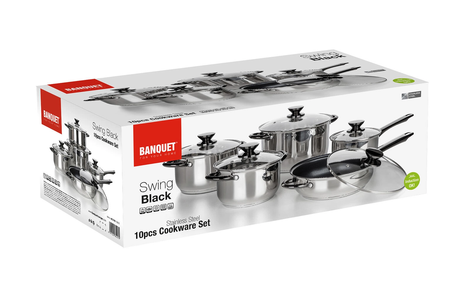 The SWING Black cookware set delivers a balanced blend of durability, functionality, and modern design. The stainless steel body with a multi-layer sandwich base ensures even heat distribution and reliable performance on all cooktops, including induction. Glass lids with a steam vent enable precise cooking control.