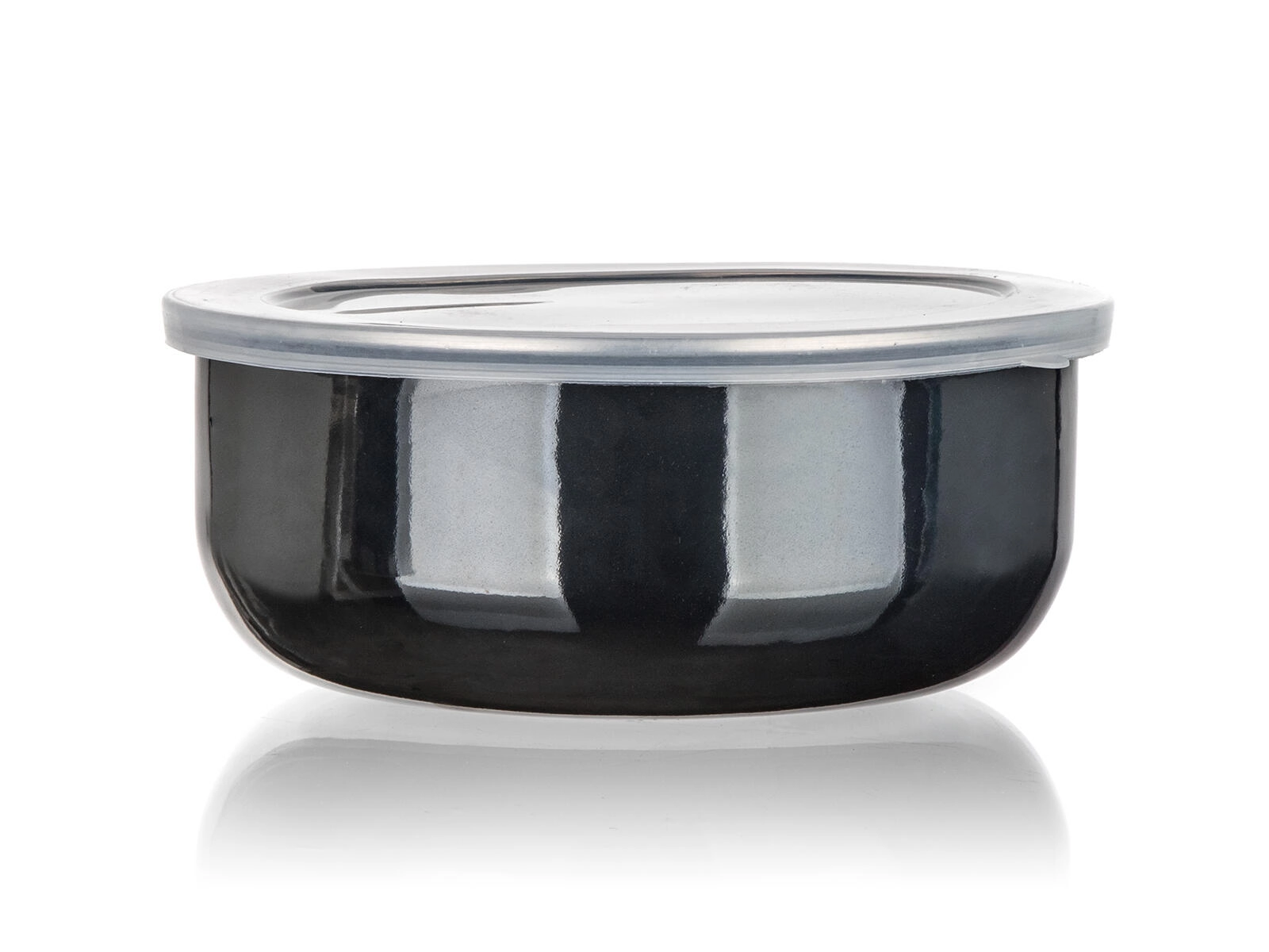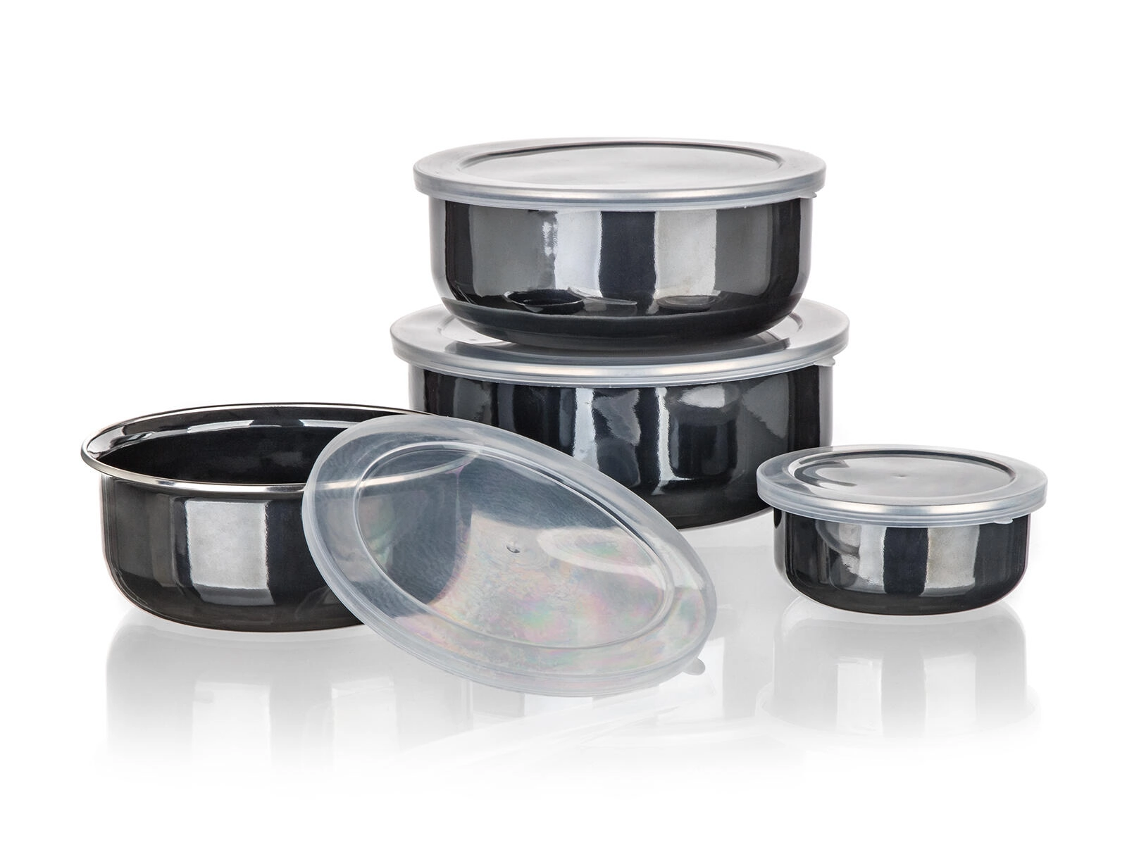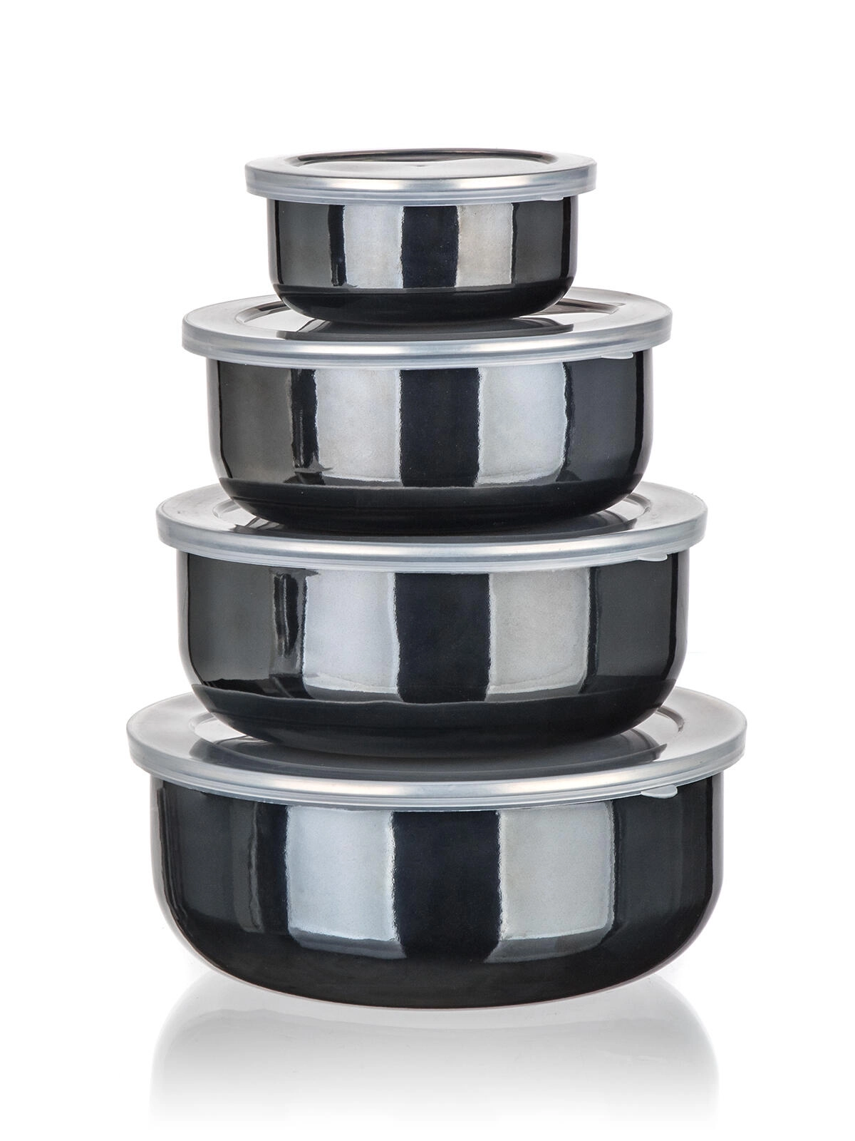 A practical set of enamel bowls with plastic lids METALIC Black in an elegant black color for everyday use. Four sizes with nesting design save space, sealing lids help keep food fresh longer, and durable enamel ensures easy maintenance. Ideal for food storage in the fridge and on the go.