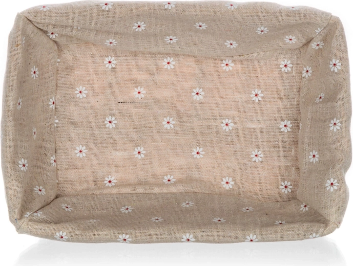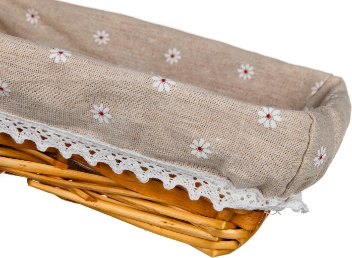 The Daisy basket combines traditional wicker weaving with a soft fabric liner featuring tiny daisies. Thanks to its natural look and subtle lace, it fits beautifully into rustic, country, and Scandinavian interior styles. It is intended primarily for decorative use—ideal for bread, fruit, napkins, cosmetics, or small household items.