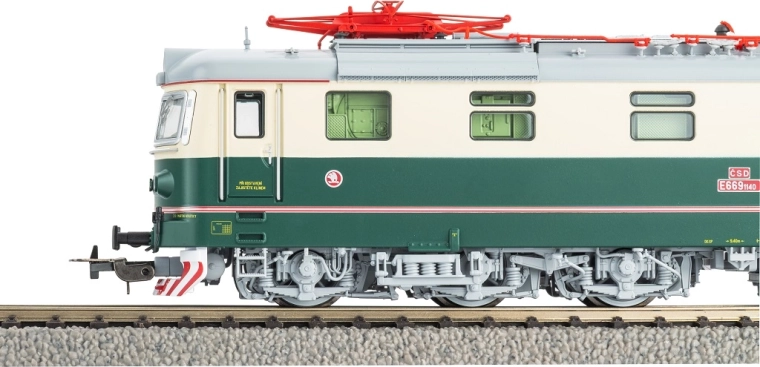 This six-axle electric locomotive of class E 669.1 in the iconic CSD livery faithfully captures the robust freight workhorse that dominated heavy traffic for decades. The Piko model impresses with fine surface details, realistic bogies, precise printing, and two metal scissor pantographs. Thanks to the NEM 658 PluX22 interface, it is ready for easy sound installation.
