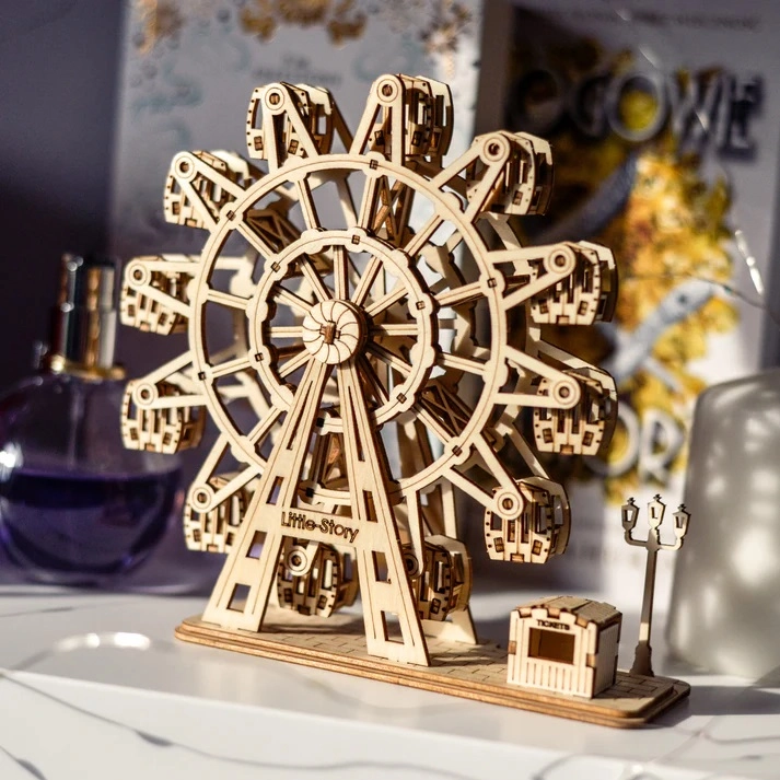 Discover the joy of making with a 3D model from Little Story – a precisely cut wooden puzzle that offers a fun challenge without using glue. The parts are pre-cut and numbered, making assembly smooth and straightforward. High-quality materials ensure strength, safety, and a beautiful look, and the finished Ferris wheel model becomes a stylish interior decoration.