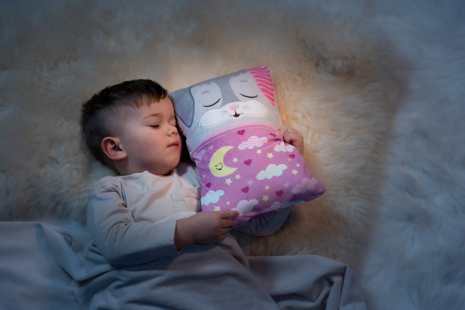 With a single flip, the bunny changes colors and expression — stimulating play by day and calming for sleep at night.