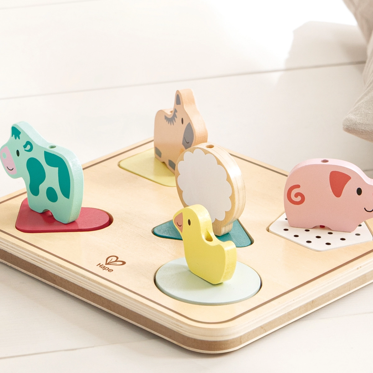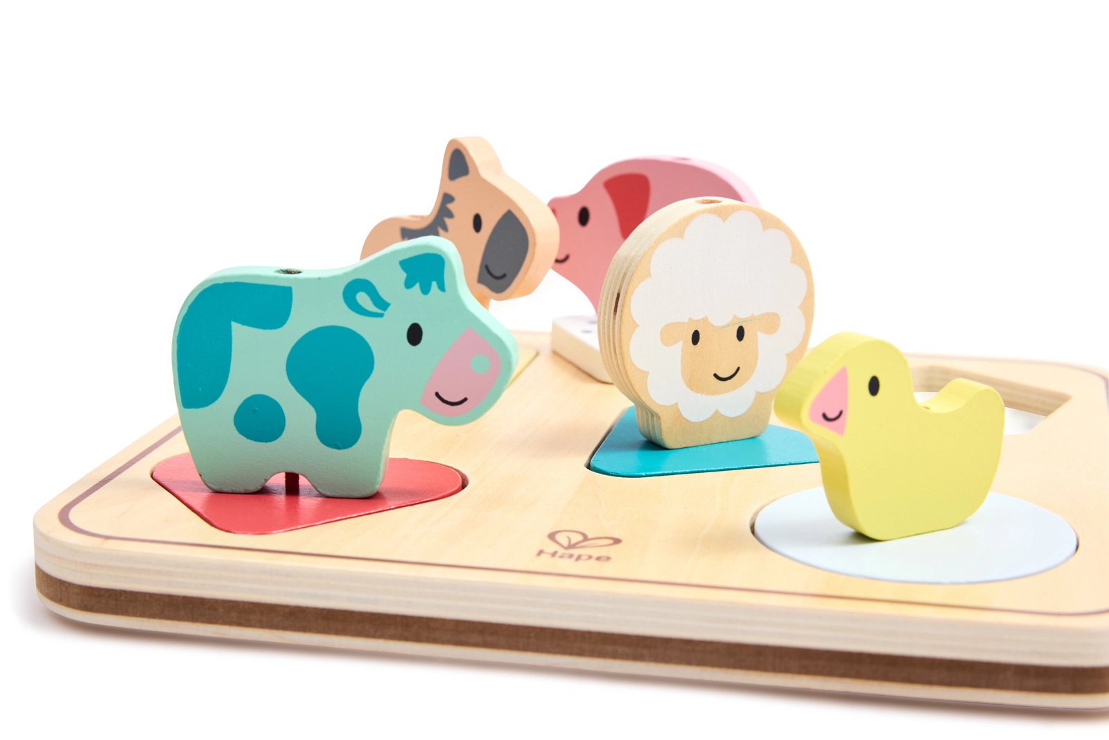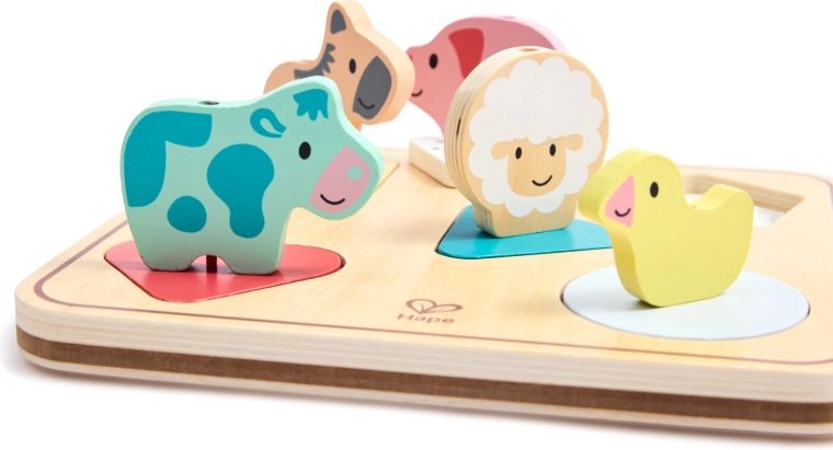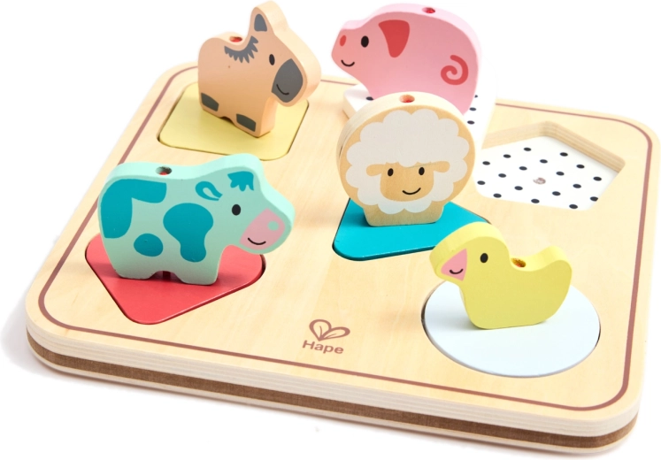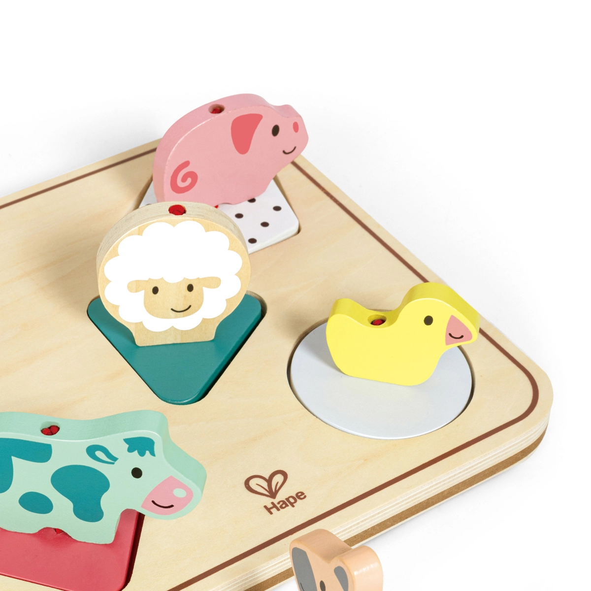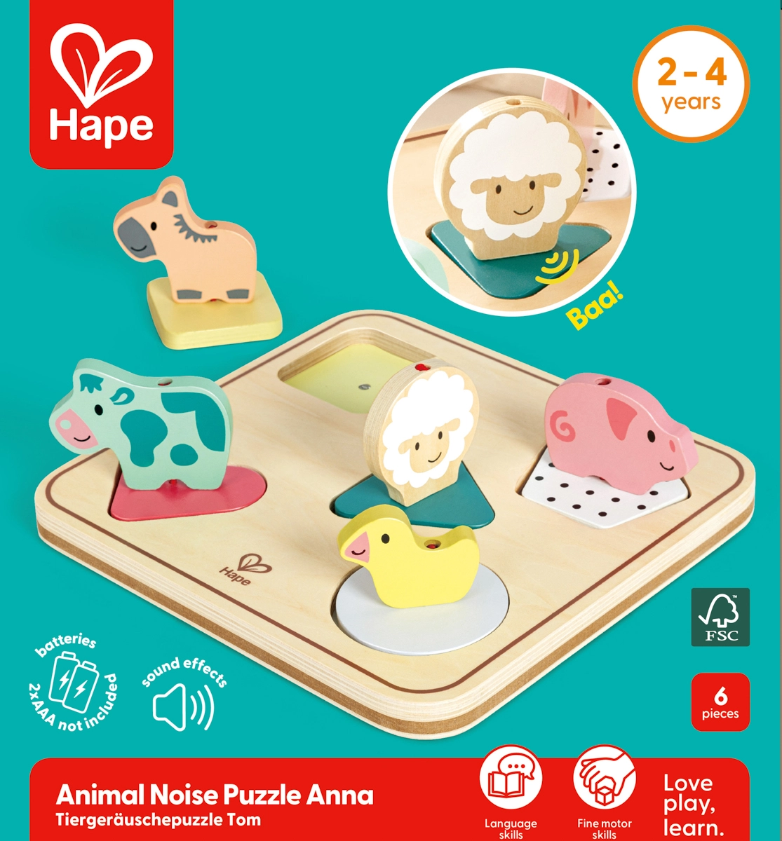 Discover the fun wooden sound puzzle from HAPE that helps kids learn to recognize farm animals, colors, and shapes. When a piece is placed correctly, an authentic animal sound plays, supporting fine motor skills, coordination, and the joy of learning through play. Made from durable FSC-certified wood with child-safe paints. Suitable from 2 years.