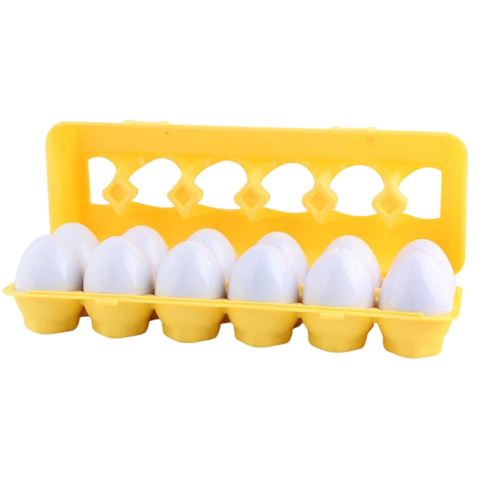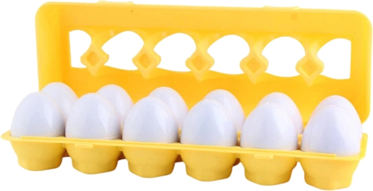 Explore the world of colors, shapes, and tasty motifs with this playful egg sorter. Each of the 12 plastic eggs hides a different shape and vivid color inside, naturally guiding children to match pairs and repeatedly practice finger skills. Thanks to safe workmanship and smooth edges, the set is suitable for young children.