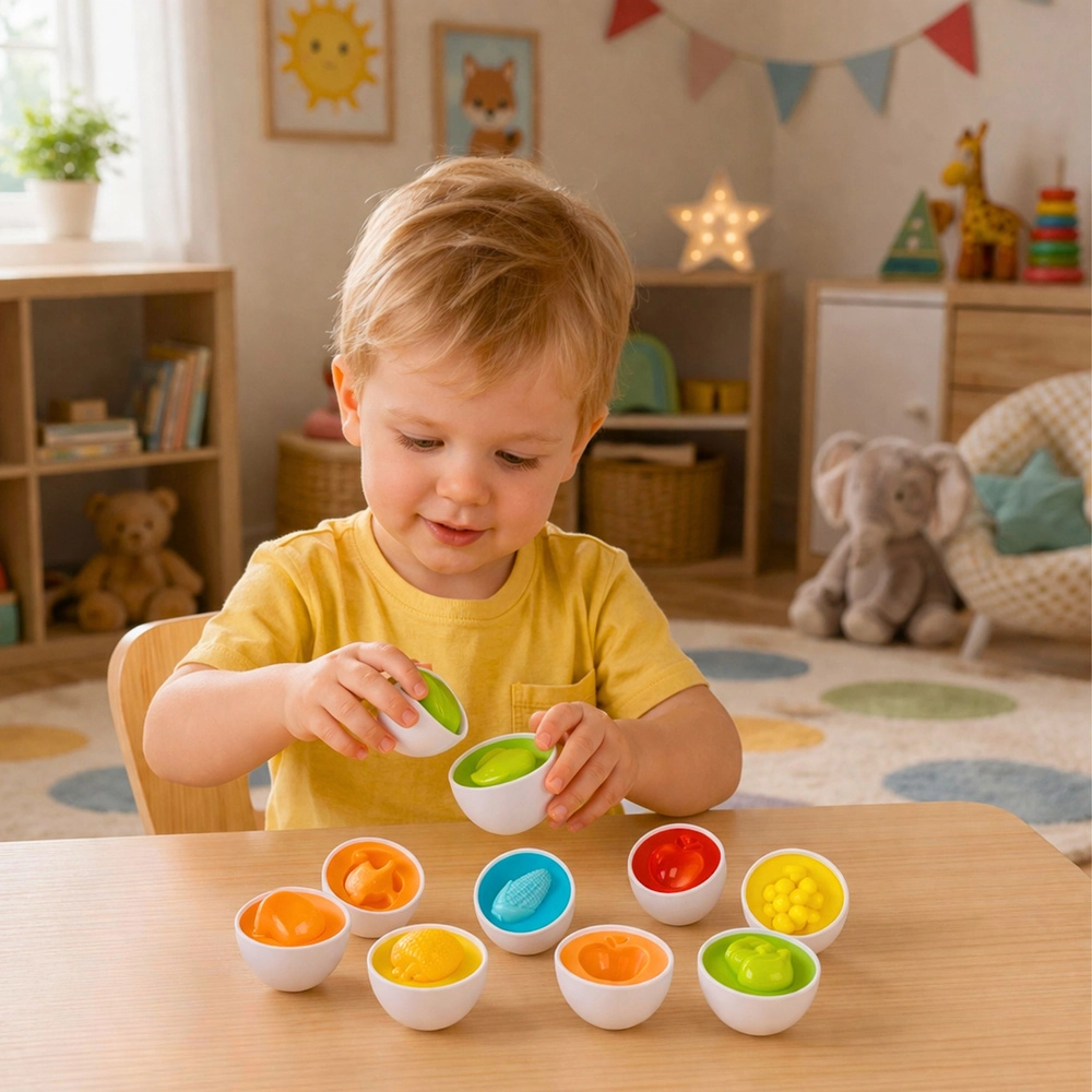 Each egg has a unique shape and a brightly colored interior with a fruit or vegetable motif. Children practice logic, memory, and color differentiation while correctly pairing the halves.