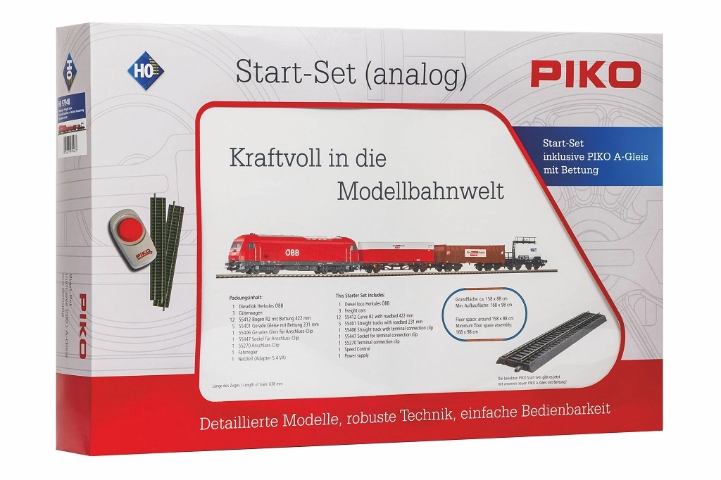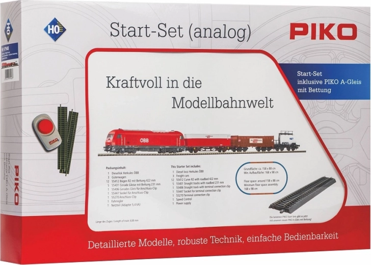 A complete model railway set from PIKO for H0 scale that includes everything for immediate running: a ÖBB Hercules diesel locomotive, 3 freight cars, a PIKO A-Gleis oval with roadbed, a power supply, and an analog controller. Thanks to easy assembly, reliable operation, and expandability plus digital readiness (NEM 652), it is ideal for beginners and advanced users alike.