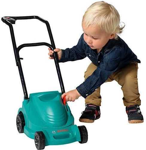 The KLEIN BOSCH kids' lawn mower brings the joy of make-believe gardening and sparks imagination. Thanks to its lightweight plastic design and stable, moving wheels, it’s easy to handle on different surfaces. When pushed, it produces a mechanical sound that imitates a real mower at work, making play even more realistic—without the need for batteries.