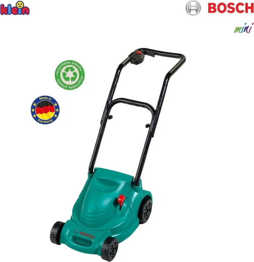Imitate real gardening with the KLEIN kids' lawn mower under the BOSCH license. A lightweight and durable plastic mower with four large wheels, a realistic mock switch, and a mechanical mowing sound when moving. Great for outdoor play, motor skill development, and no batteries.