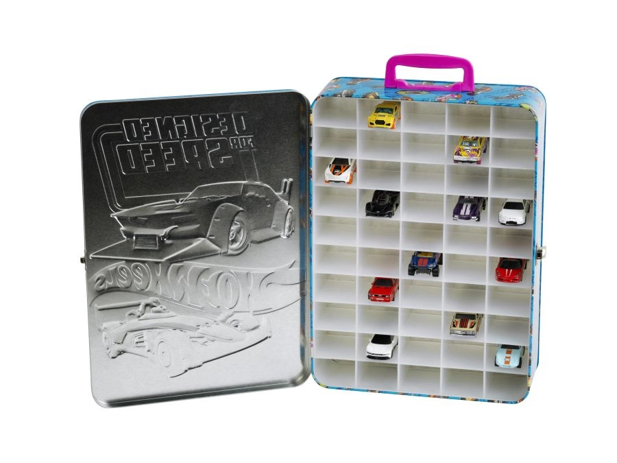 Practical metal case for 50 HOT WHEELS cars with clearly organized compartments, a secure metal latch, and an orange handle for comfortable, safe carrying. Inside is a translucent plastic insert for a quick overview. Cars not included.