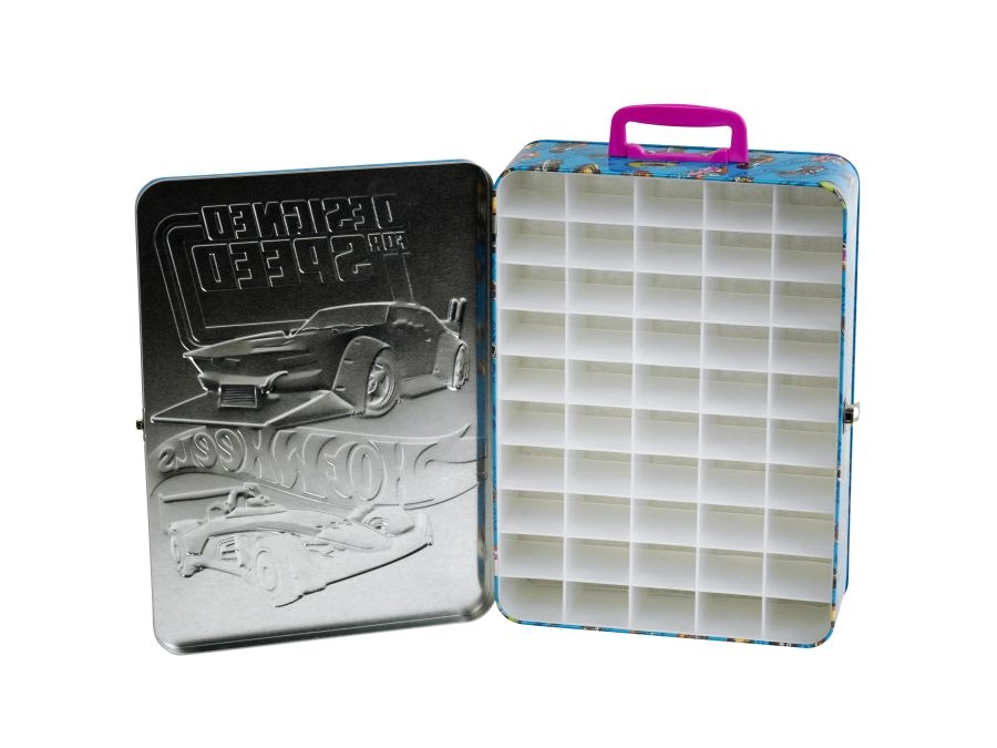 A durable metal body with colorful printing and the HOT WHEELS logo, a comfortable orange handle, and a reliable metal latch to prevent accidental opening make this case an ideal storage solution at home or on the go.