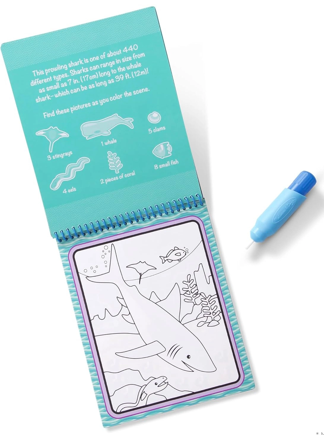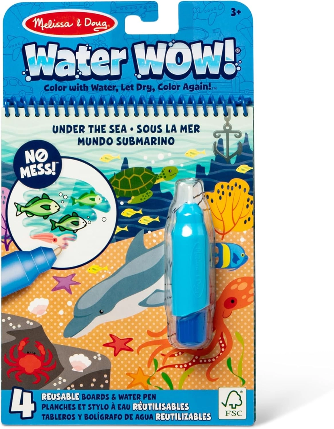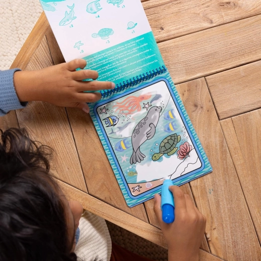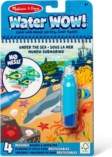 This reusable set includes 4 sturdy, spiral-bound boards with underwater themes and a refillable water pen. Kids paint with only water, so no mess on hands or furniture. When the pages dry, the colors disappear and the fun can start all over again.