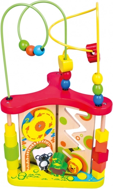 This multifunctional wooden activity maze from Bino is designed to entertain while developing skills. Beads on metal wires, rotating and sliding elements, and illustrated animal motifs stimulate curiosity, focus, and hand–eye coordination.