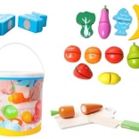 A fun and safe set for little chefs: wooden fruit and vegetables with hook-and-loop that can be cut and reattached. Includes a knife and cutting board, all tidied away in a practical bucket. The playset develops fine motor skills, creativity, and teaches colors and food names. Ideal for children aged 3+.