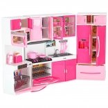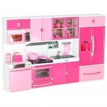 The set includes a microwave and dishwasher, a stove with oven, a display cabinet with sink, and a fridge with drawer. Kids can enjoy a complete scenario of cooking, baking, and cleaning.