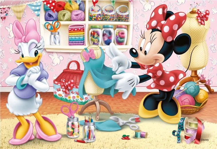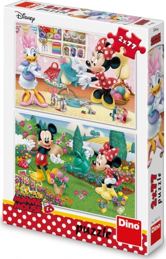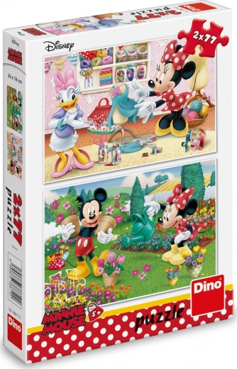 This set offers 2 puzzles with 77 pieces each featuring beloved characters Minnie, Mickey, and Daisy in joyful scenes full of flowers and crafting. The sturdy pieces made of quality cardboard are easy to hold and fit precisely together, making them ideal for children learning patience and dexterity.