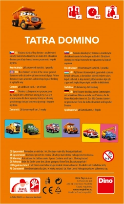 Lightweight DINO TATRA domino with 28 tiles made of non-toxic cardboard. Exercises attention and logic, ideal for travel. Made in the Czech Republic.