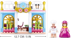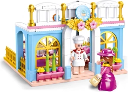 An adorable vintage bakery building set from the Sluban Girl's Dream Village series brings 199 pieces, 2 minifigures with movable parts, and plenty of accessories for pastry-shop storytelling. The bricks are made of quality ABS plastic, offer a medium difficulty, and are compatible with LEGO, Cobi, and Mega Bloks – ideal for developing creativity in children aged 6+.