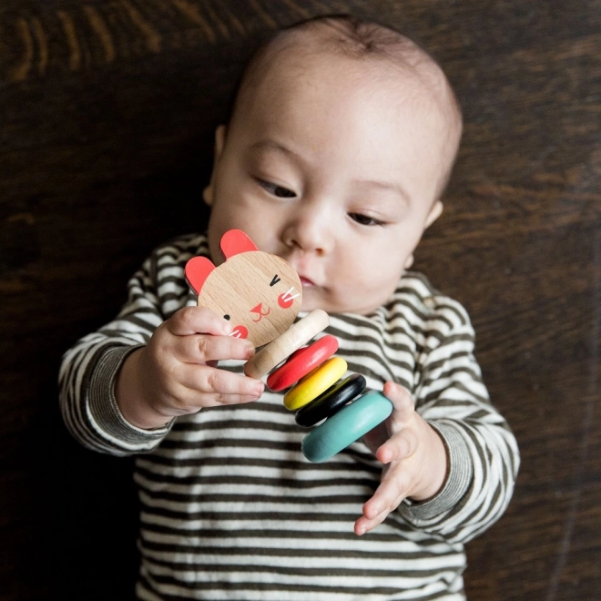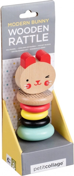 A cute wooden bunny-shaped rattle from Petit Collage delights babies with a gentle, soothing sound. It features five smooth beech rings ideal for little hands, bright colors and patterns to stimulate the senses, and is made from 100% FSC-certified wood with non-toxic water-based paints.